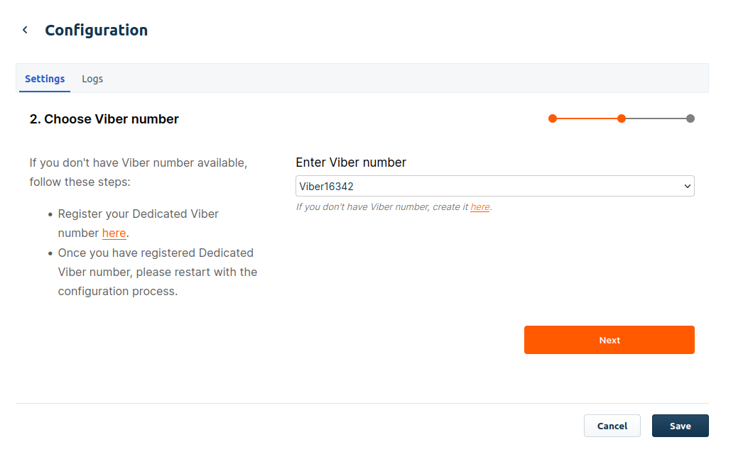 When you enter the Infobip API key correctly on the previous screen, you see a drop-down menu containing your previously purchased dedicated Viber numbers. From here, you can select which number you would like to use for this integration.