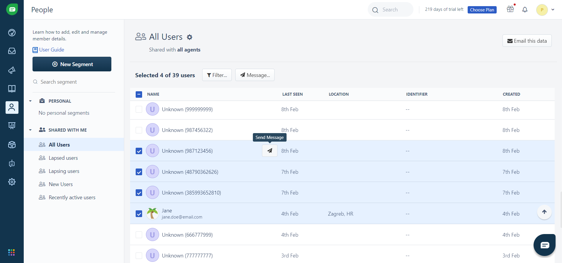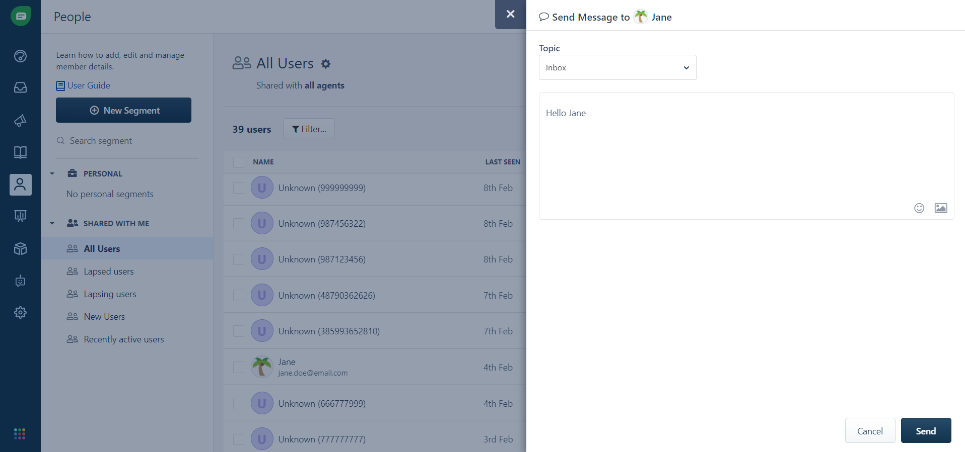 - Go to FreshChat People, find the customer record and click the Send Message button.