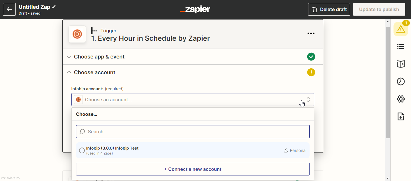 - Choose a connected Infobip account. If you don't have connected Infobip account, you should sign in with the username and API key. (If you need to create a new key, see Create or Connect Your Zapier Account.)
