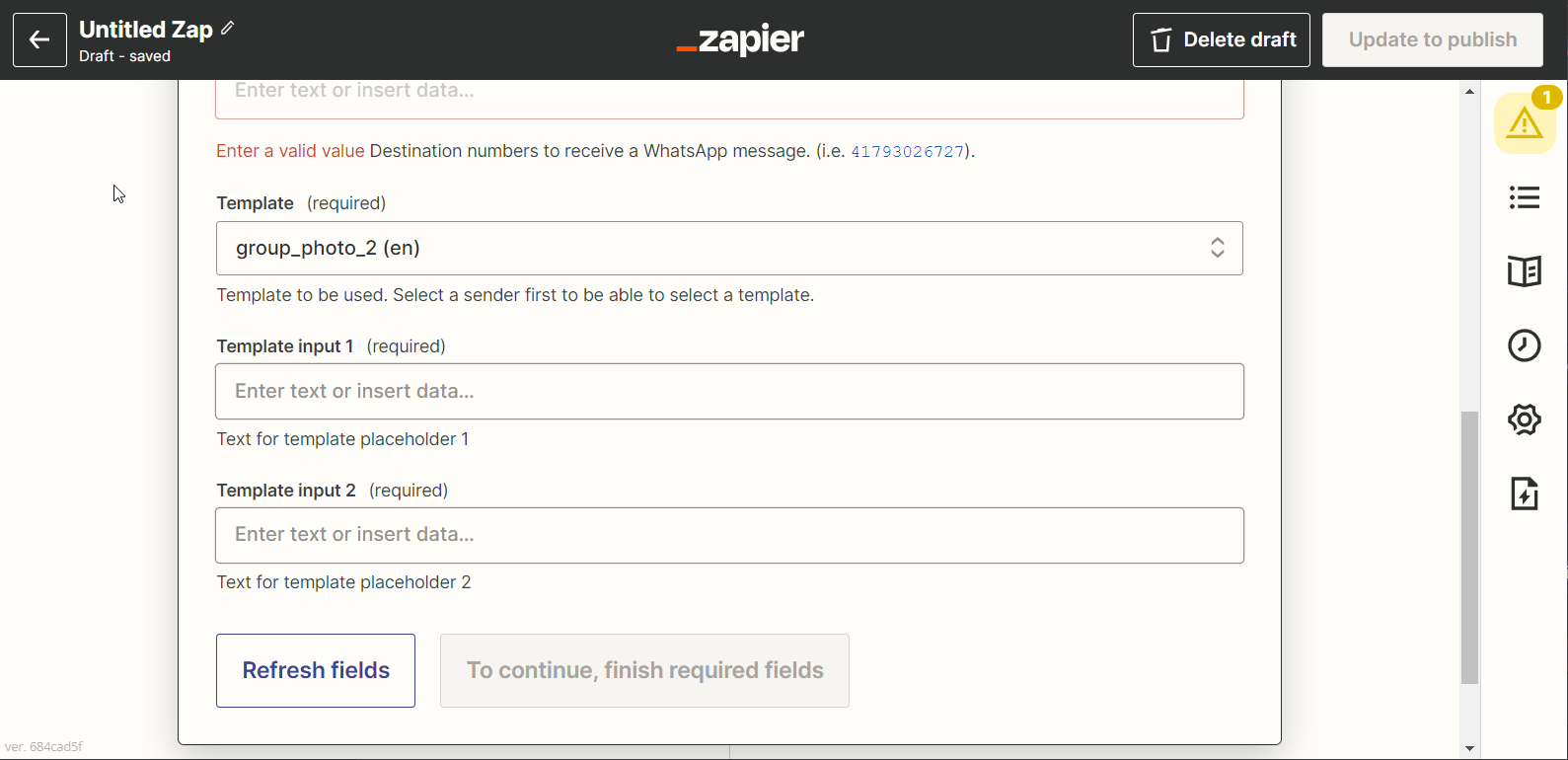 - Enter a To number. To numbers are destination numbers to receive WhatsApp messages (for example, 4916716453908). It can be a single message or a bulk message to a list of recipients. In the text input, you can add either hardcoded text to be sent or a placeholder from your previous triggers or actions.