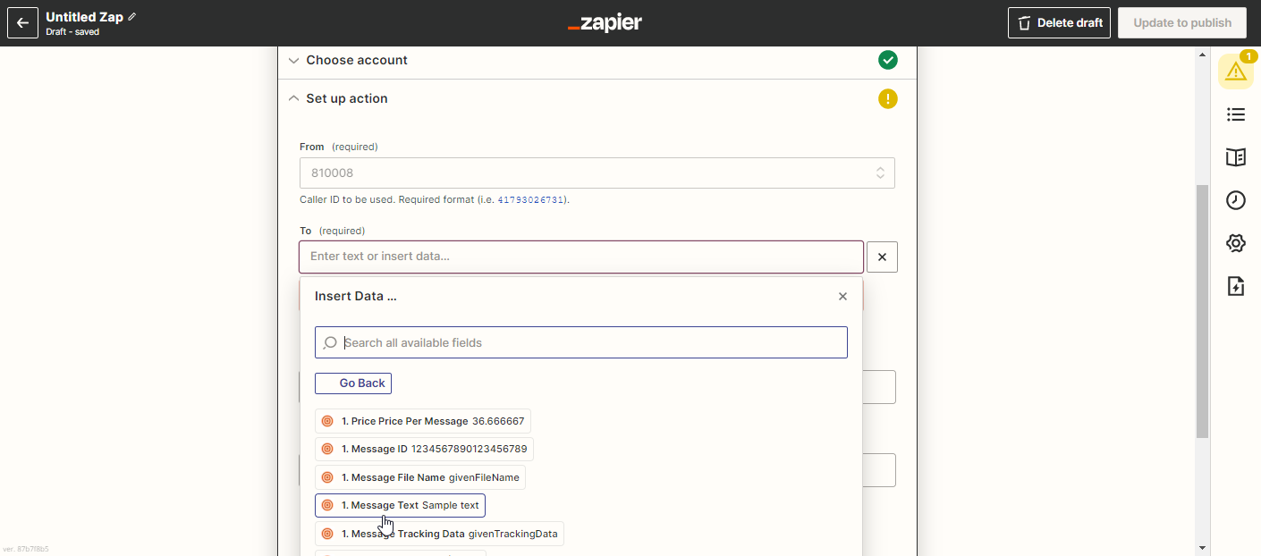 - Enter the SMS text. In the text input, you can either add a hardcoded text to be sent or you can use a placeholder from your previous triggers or actions.