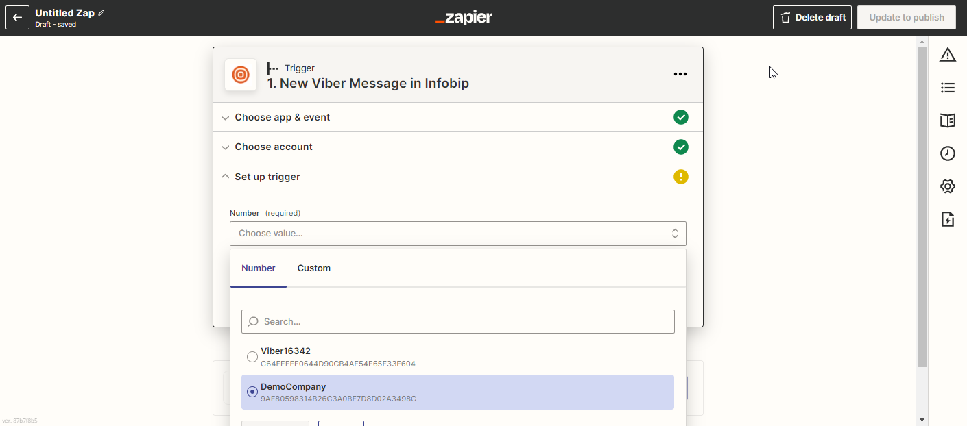 An automated Zapier workflow is called a zap. A zap is initiated by a trigger, which is an event like the receipt of an SMS or Viber message. A zap's response to a trigger is an action. For example, an SMS message sent to one system could trigger a voice call action from Infobip.