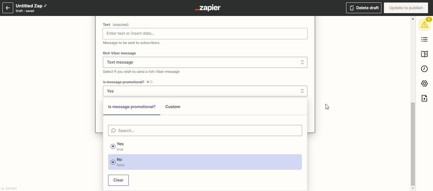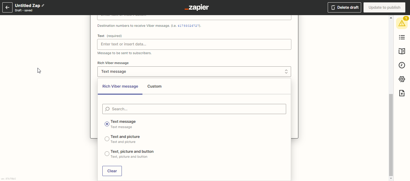 - Enter the Viber message text. In the text input, you can either add a hardcoded text or you can use a placeholder from your previous triggers or actions.