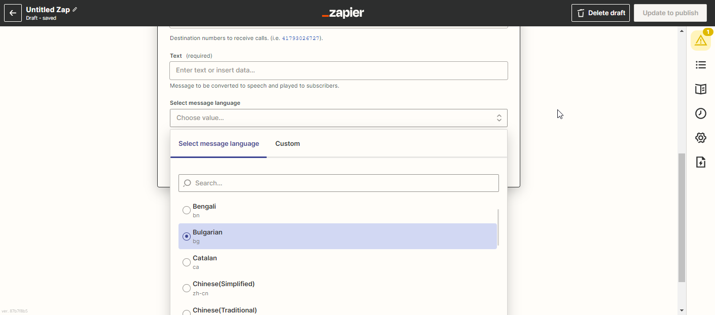 - To numbers are Destination numbers to receive Voice calls (such as 4916716453908). It can be a single message or a bulk message to a list of recipients. In the text input, you can either add a hardcoded text to be sent or you can use a placeholder from your previous triggers or actions.
