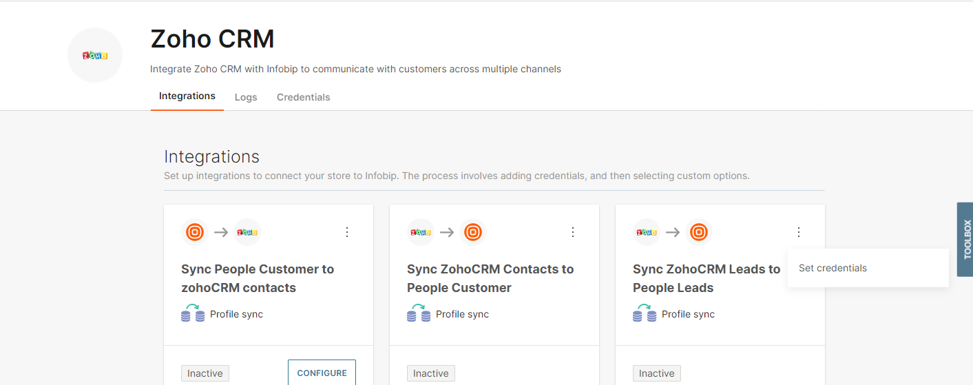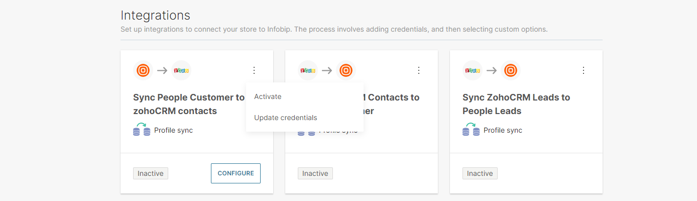 The Zoho for People integration allows you to synchronize your Zoho customer data with People, our customer data platform, and take advantage of this data to be used with Infobip solutions like Moments, Broadcast, and more.