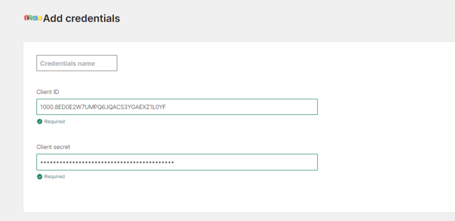 - Enter a name for the credentials and then enter the Client ID and Client secret you created in Zoho.