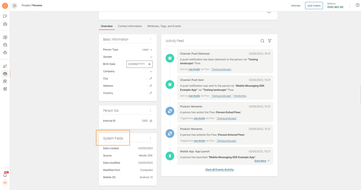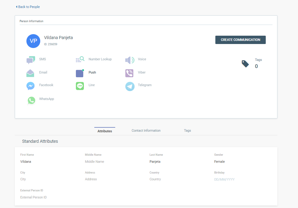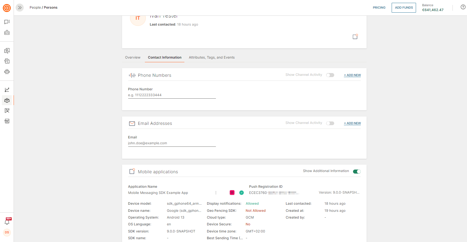 After you install and launch the Demo app, the mobile SDK notifies the Infobip platform. A person profile with the app's pushRegistrationId is automatically created in People. The pushRegistrationId is specific to the app instance and the device that has this app instance. This ID remains the same during the lifecycle of the app on the device - from the time you install the app to the time you uninstall it.