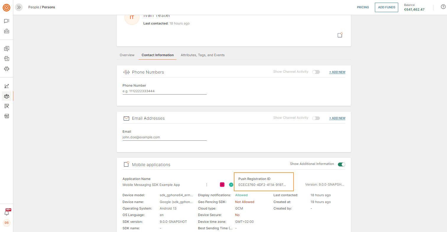 To view more information about the app, go to the Contact information tab > Mobile applications section. You can see the name of the app and the pushRegistrationId.
