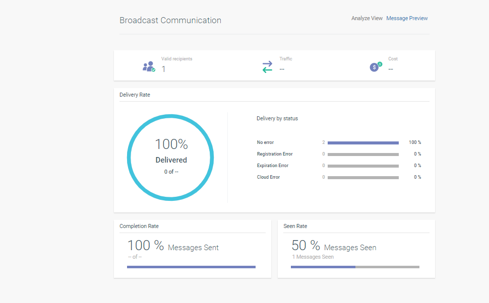 The example below shows 1 valid recipient (person profile in People) with 2 registered devices (2 messages delivered and sent). The seen rate is 50%, which indicates that the message was opened on only one of the two devices.