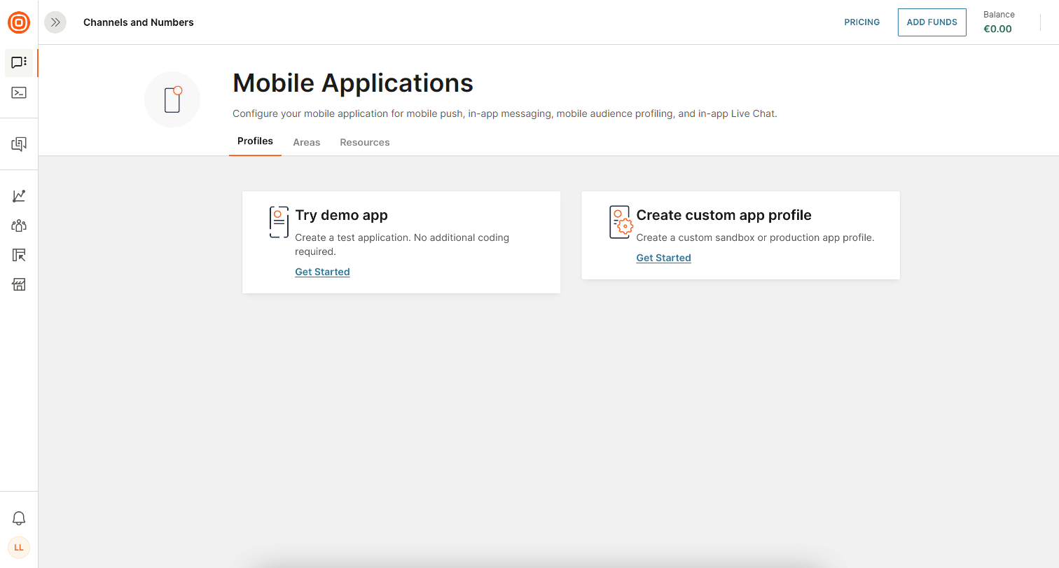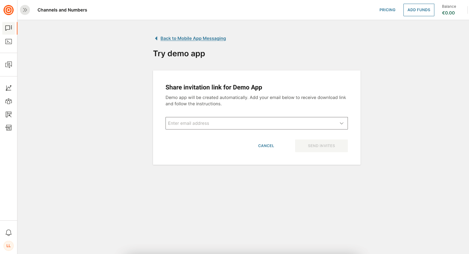 On the Infobip web interface (opens in a new tab), go to Channels and Numbers > Channels > Mobile Applications > Demo applications tab.