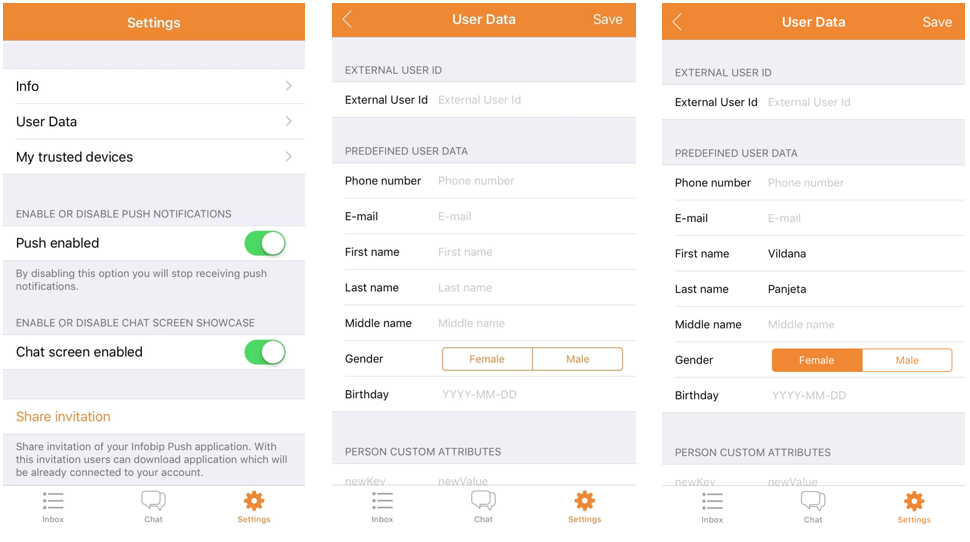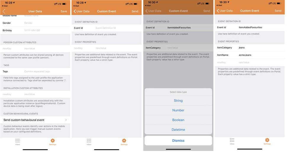 To personalize the profile, in the Demo app, go to User > Personalization data.