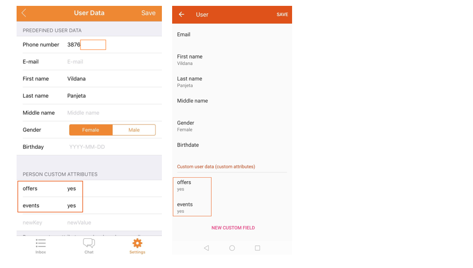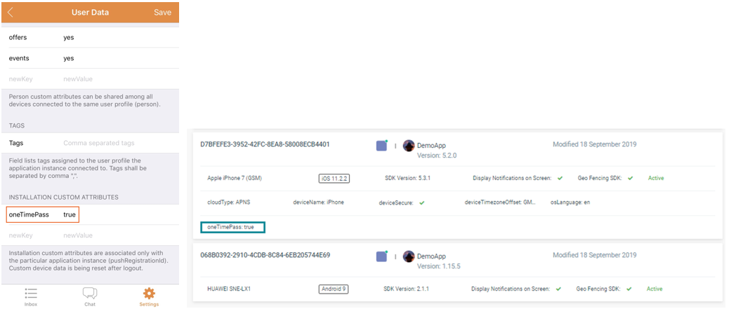 - In the Demo app, go to User > Device data > Custom device attributes.
