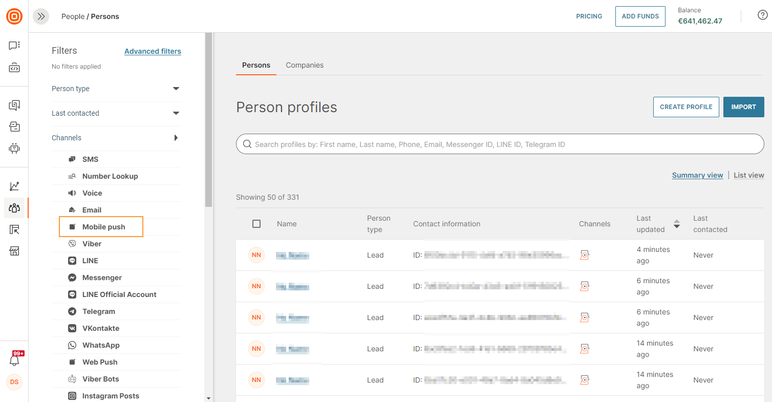To see the person profile, on the Infobip web interface (opens in a new tab), go to People > Persons. In the list of profiles, you can see a No name profile.