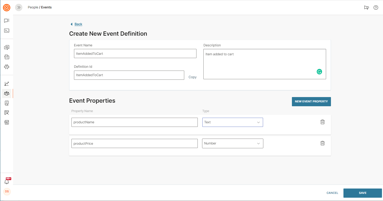 To track custom events in the demo application, make sure that you have defined the event in People.