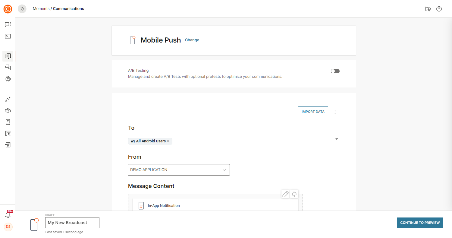 A broadcast is a one-time communication with your mobile app audience. Use Mobile push over Broadcast to send targeted messages to selected audience segments.