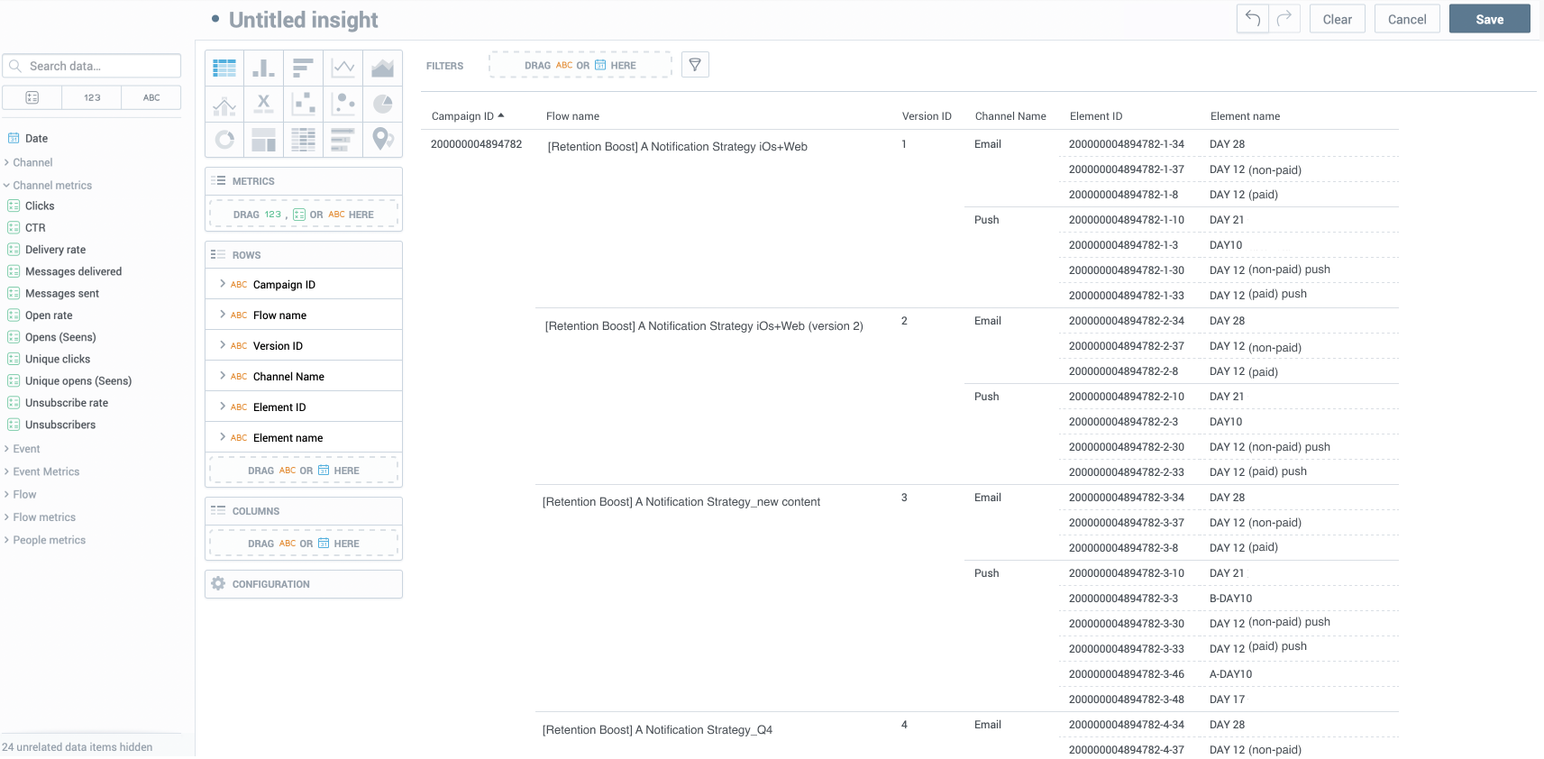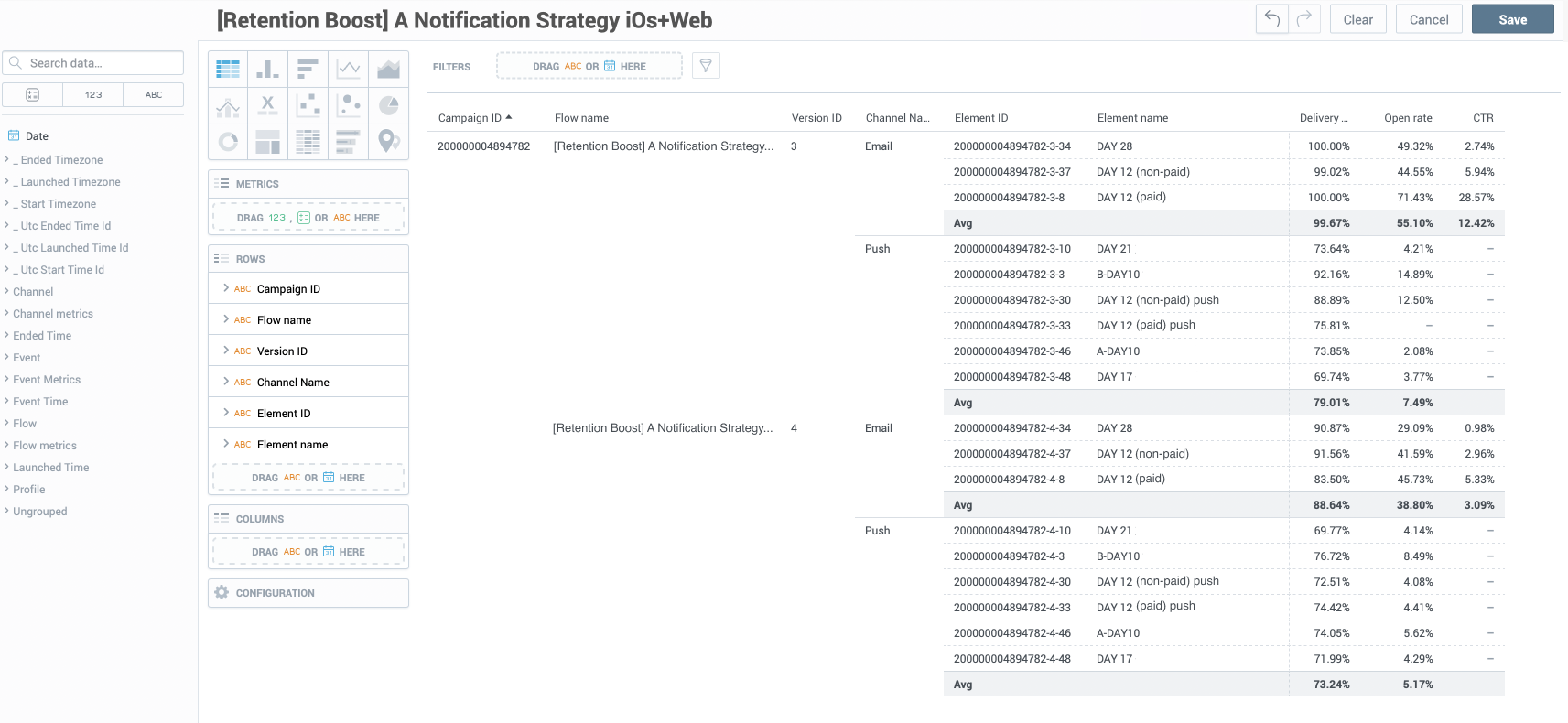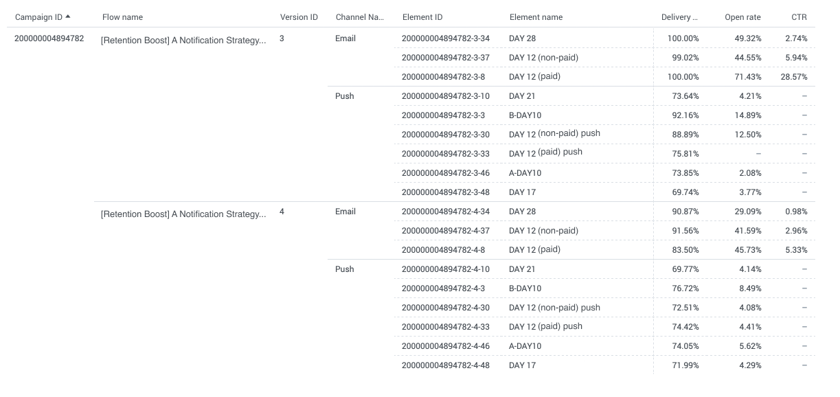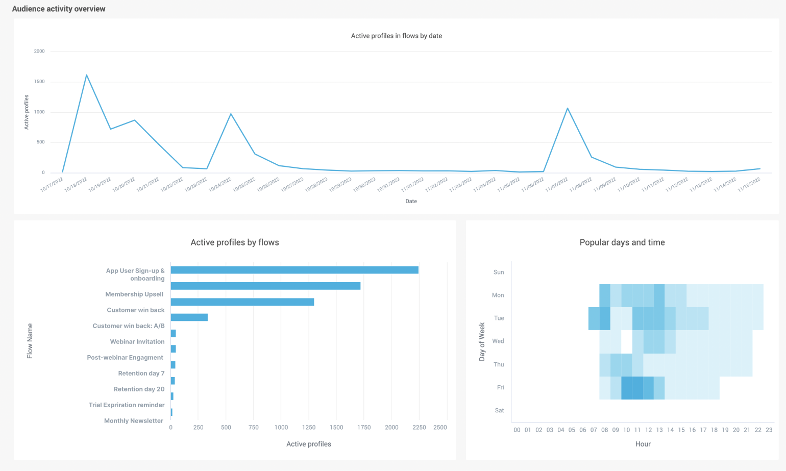 Campaign managers and analysts can find key metrics across flow campaigns and audience activity for further improvements and communication strategy optimization.
