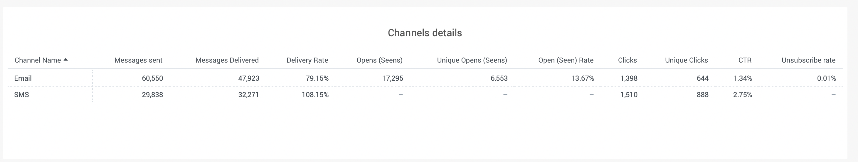 | Unsubscribe rate | Rate of unsubscription in %. (Number of unsubscribed users / delivered * 100) |