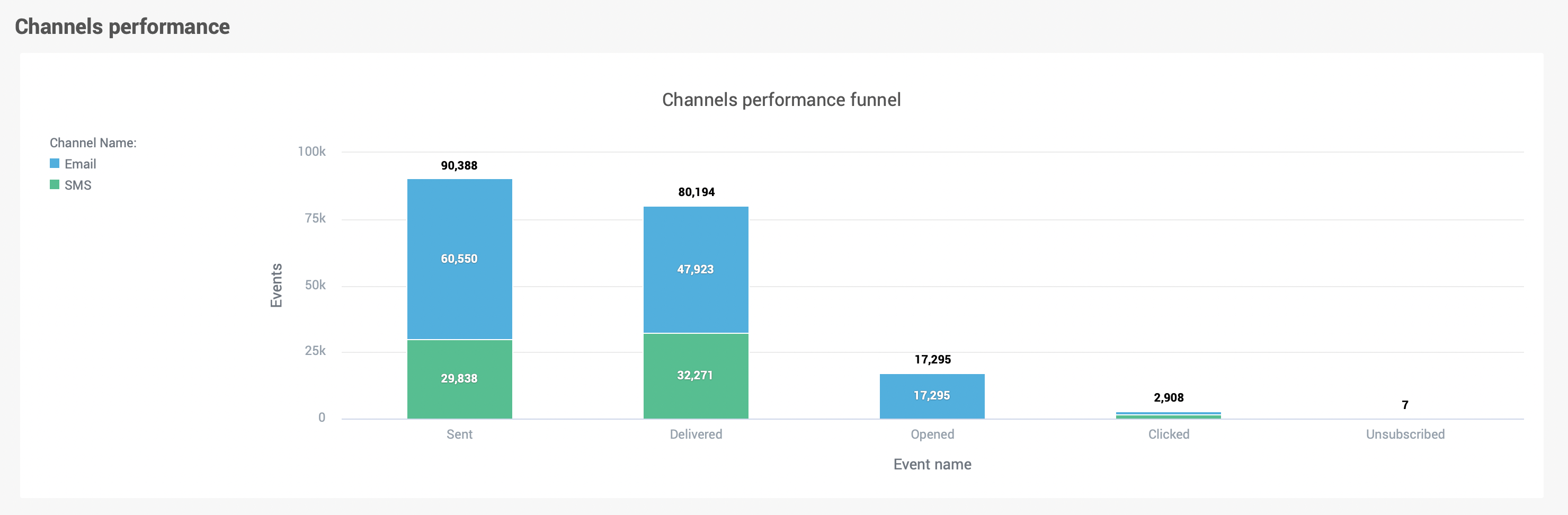 Depending on the channel, the funnel chart shows unique events breakdown by events type across all channels.