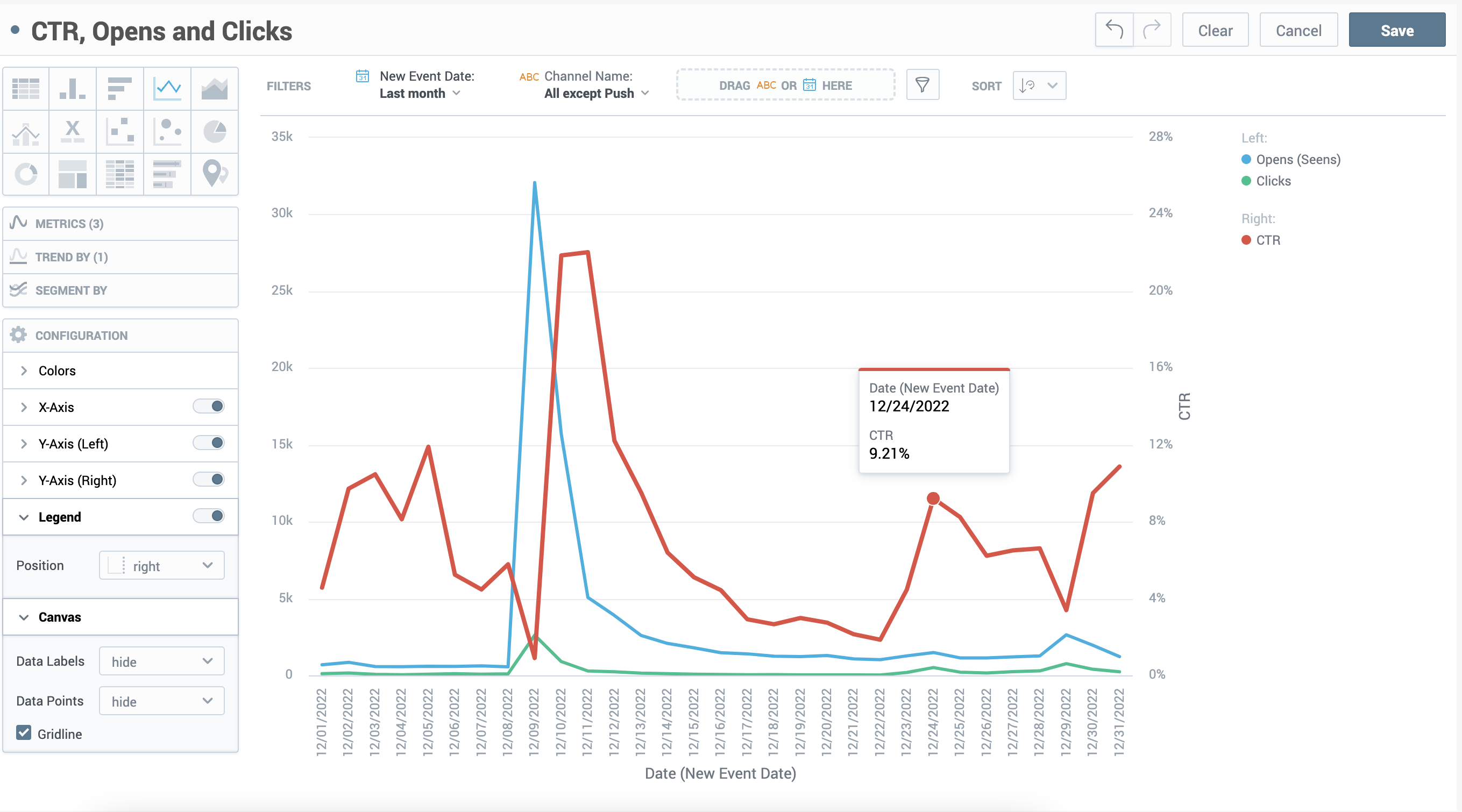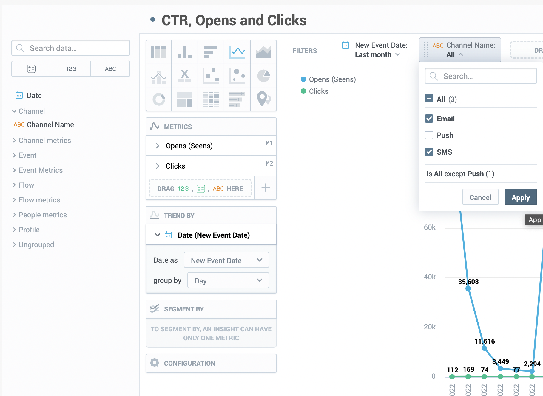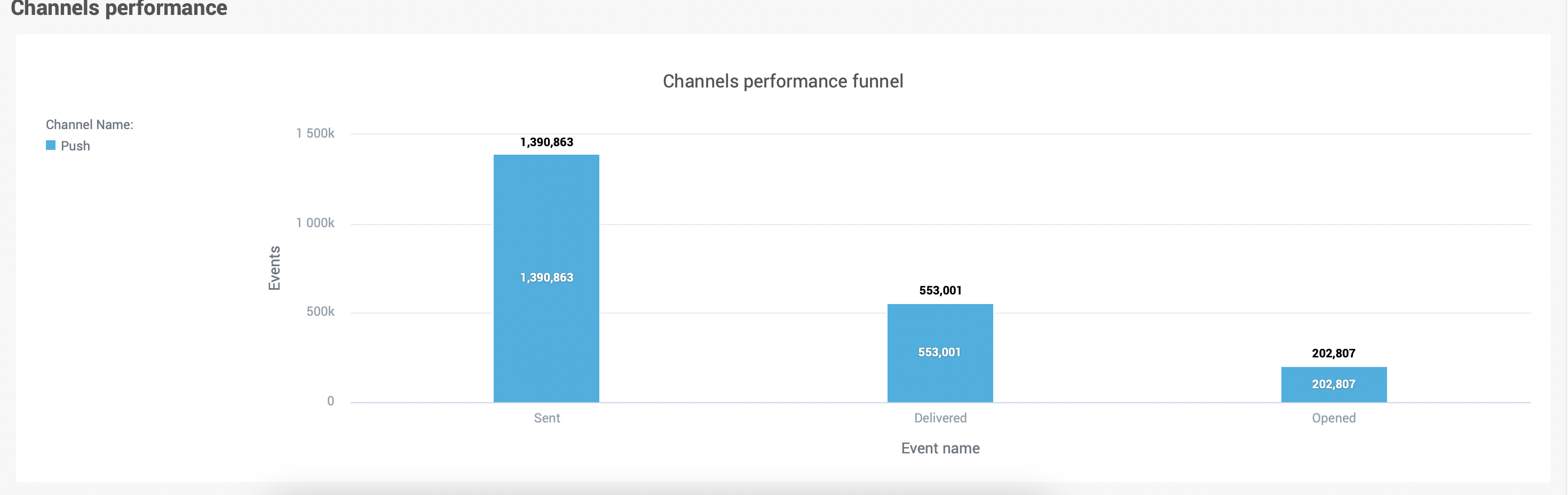 The below image shows an example of push channel performance with the sent, delivered, and opened events.