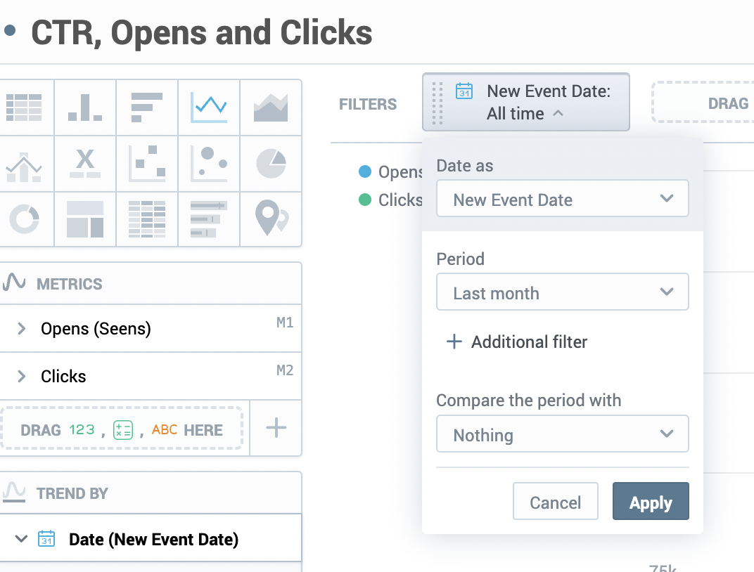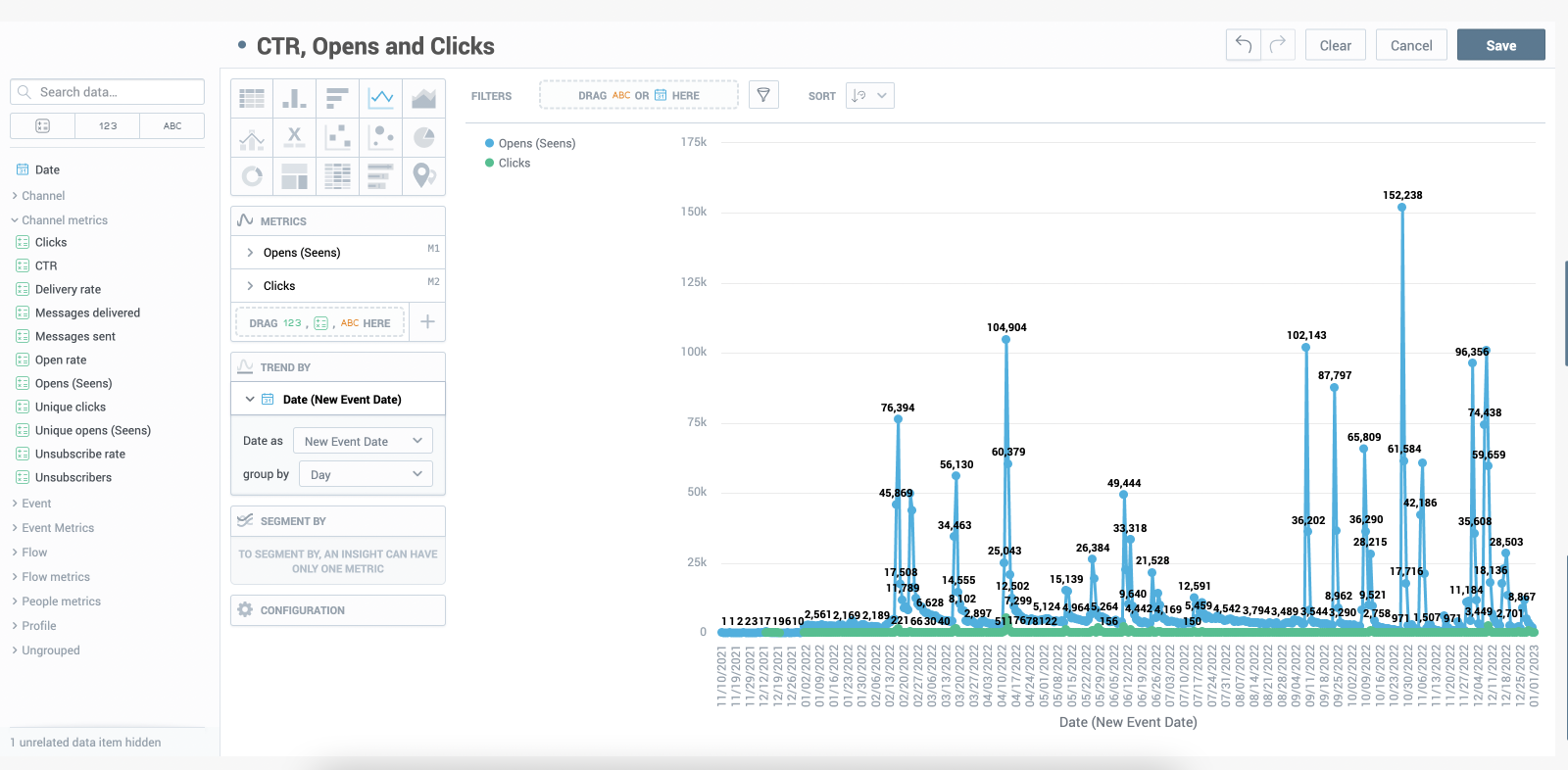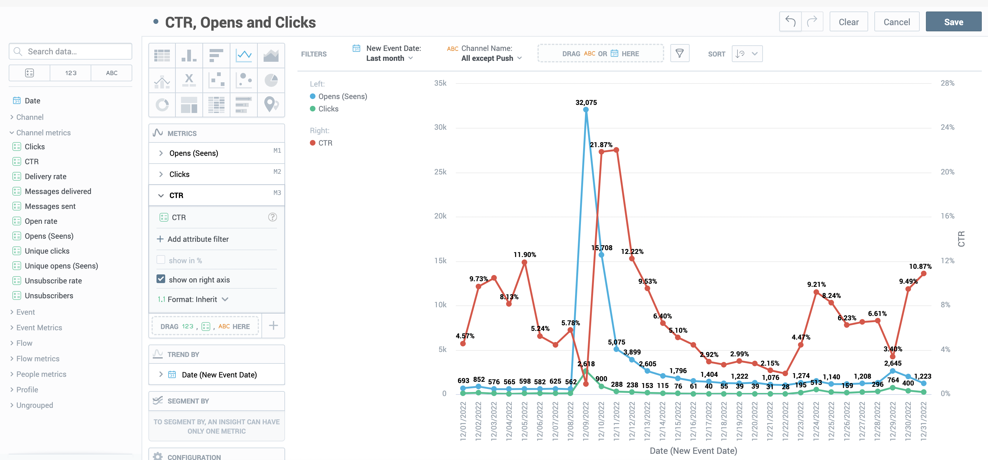 The below image shows an example of push channel performance with the sent, delivered, and opened events.