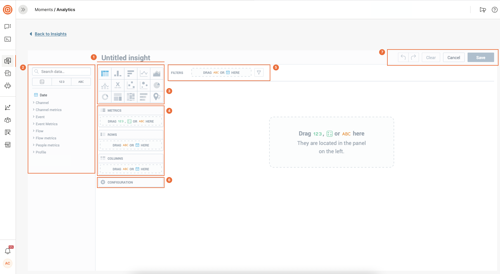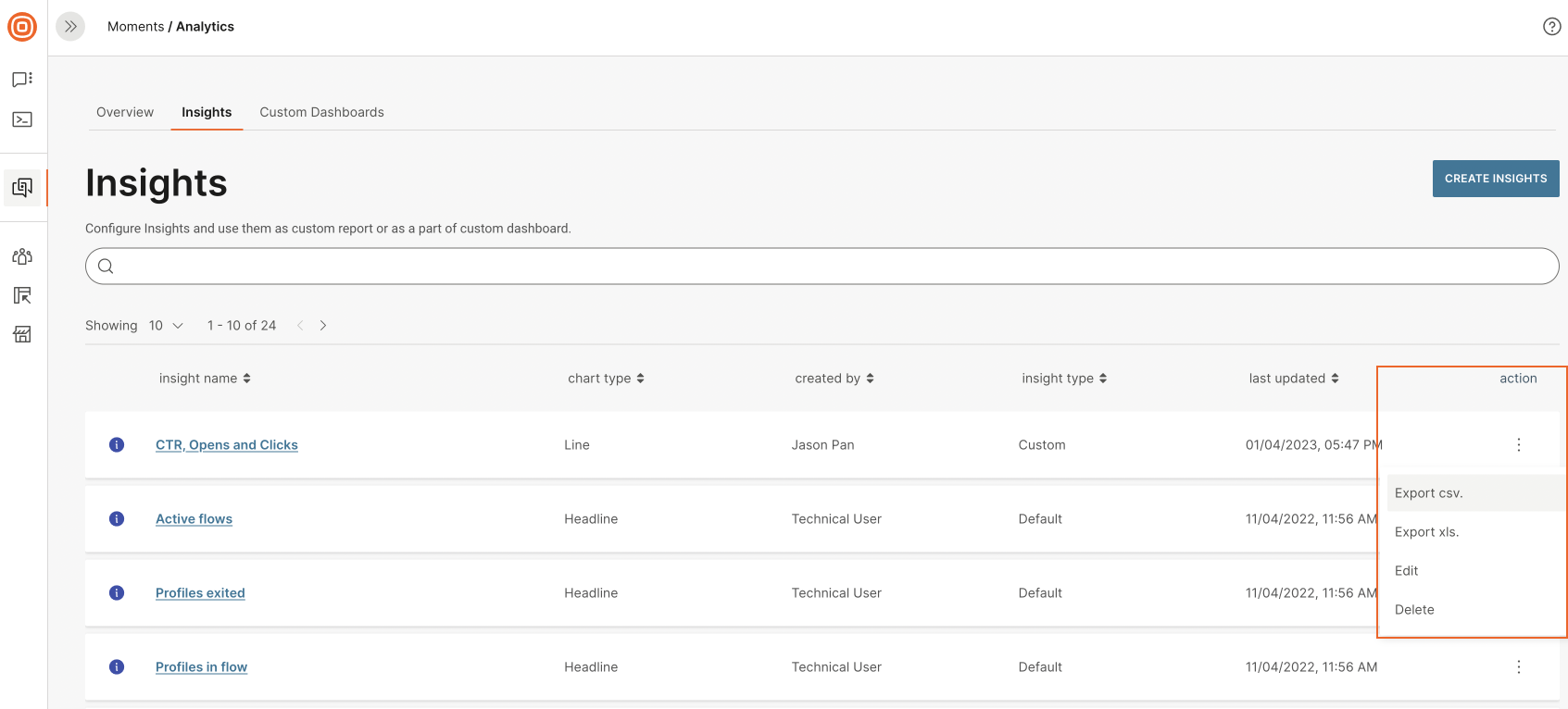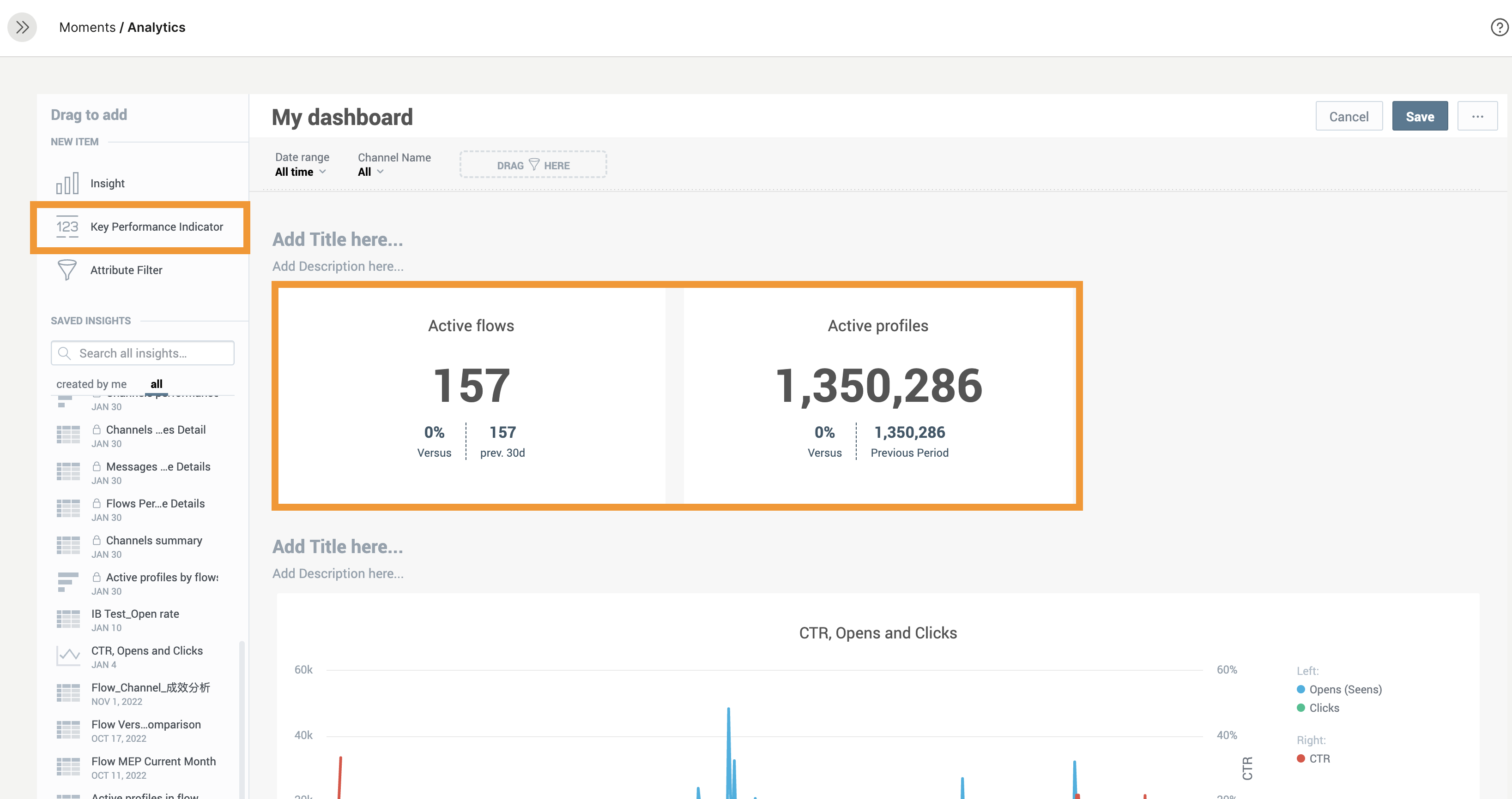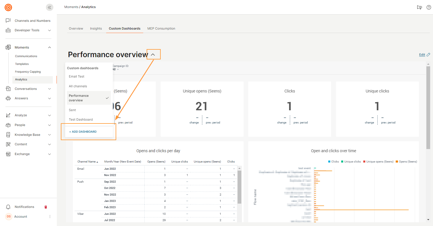 The Moments analytics tab is the main place for tracking flow campaigns performance at a glance and creating custom reports and dashboards.