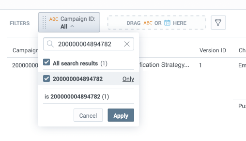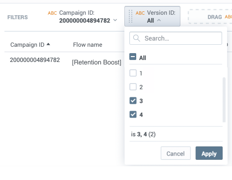 When you open the Flow dashboard, the current flow campaign ID is selected by default. You can use the Version ID filter to filter metrics by specific flow version. By default, the dashboard displays the combined metrics for all versions.