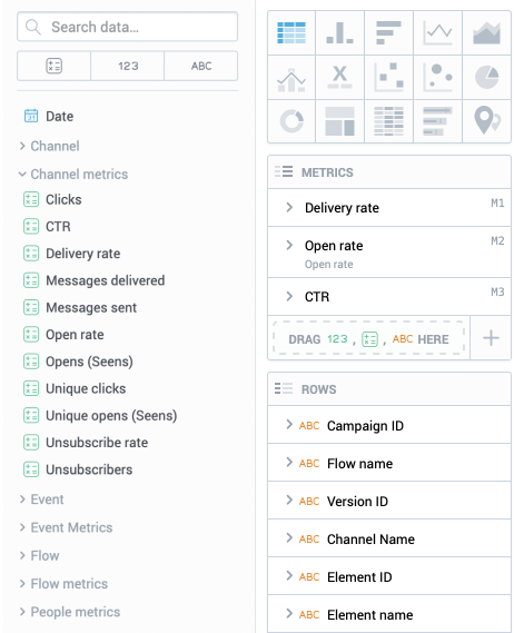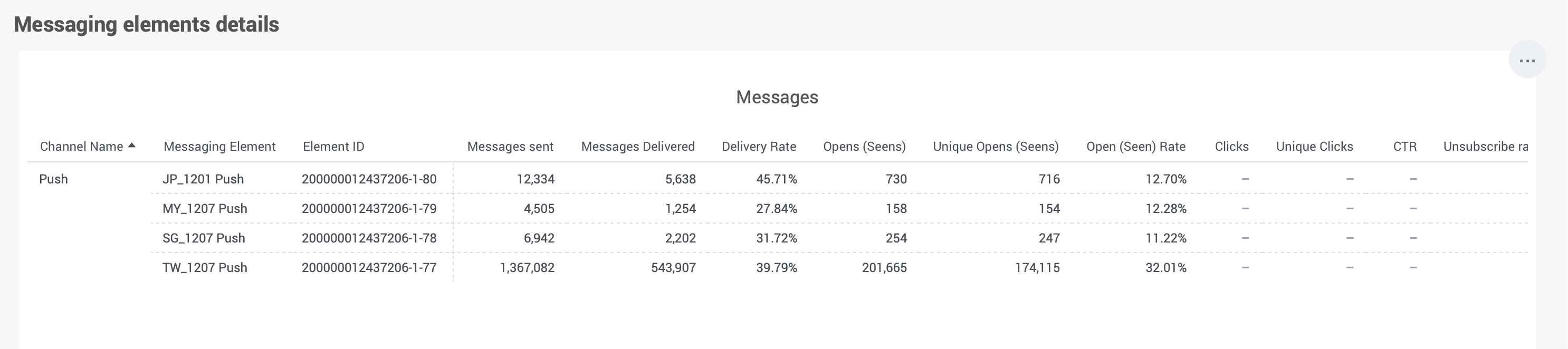 Message elements details metrics are the same as in the Channel details widget above, but it also includes a breakdown by each messaging element.