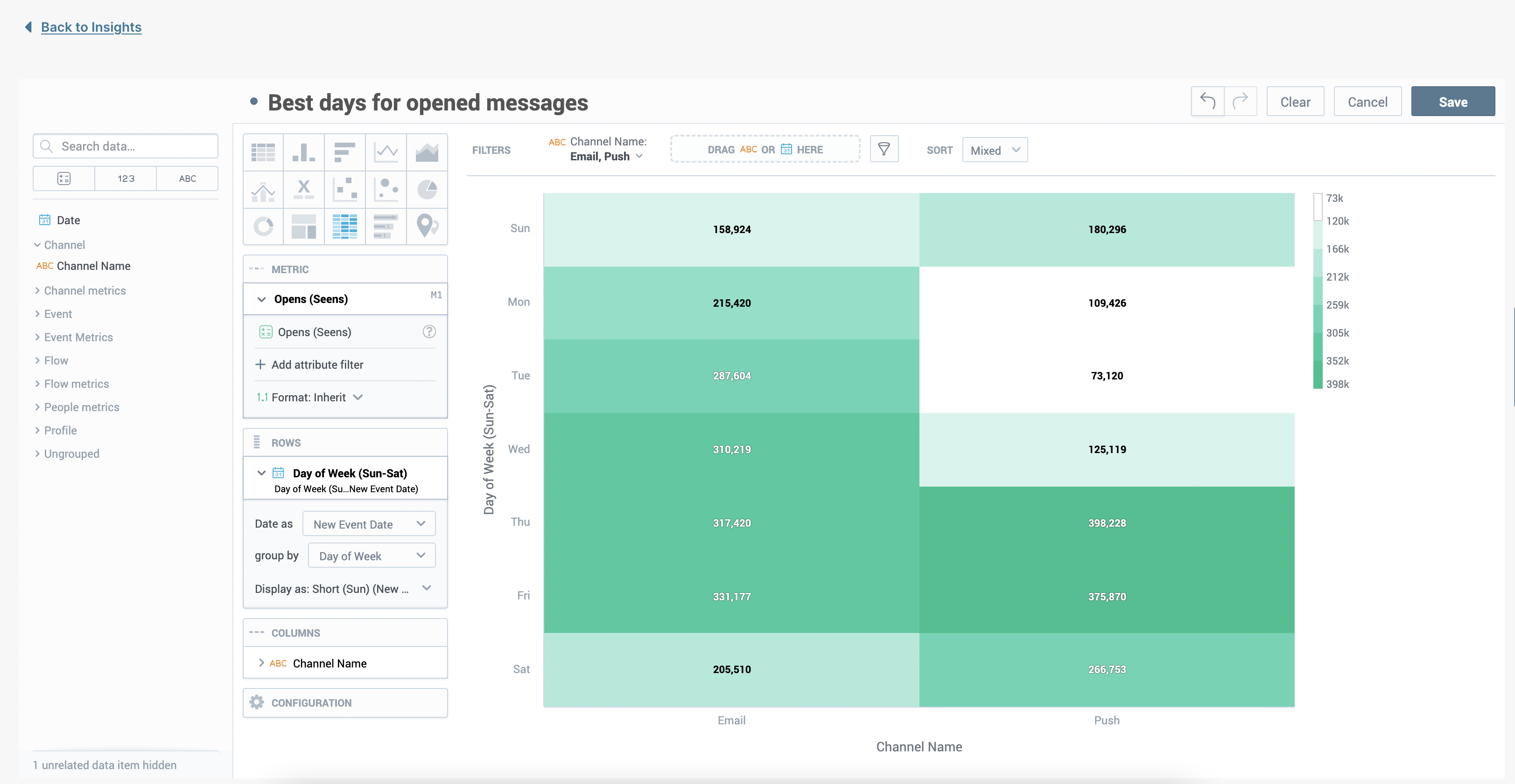 This heatmap is useful for seeing the most popular day and time for the most user activity and then using this data when you come to plan new campaigns.