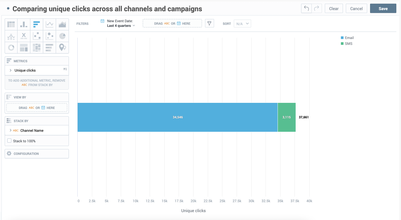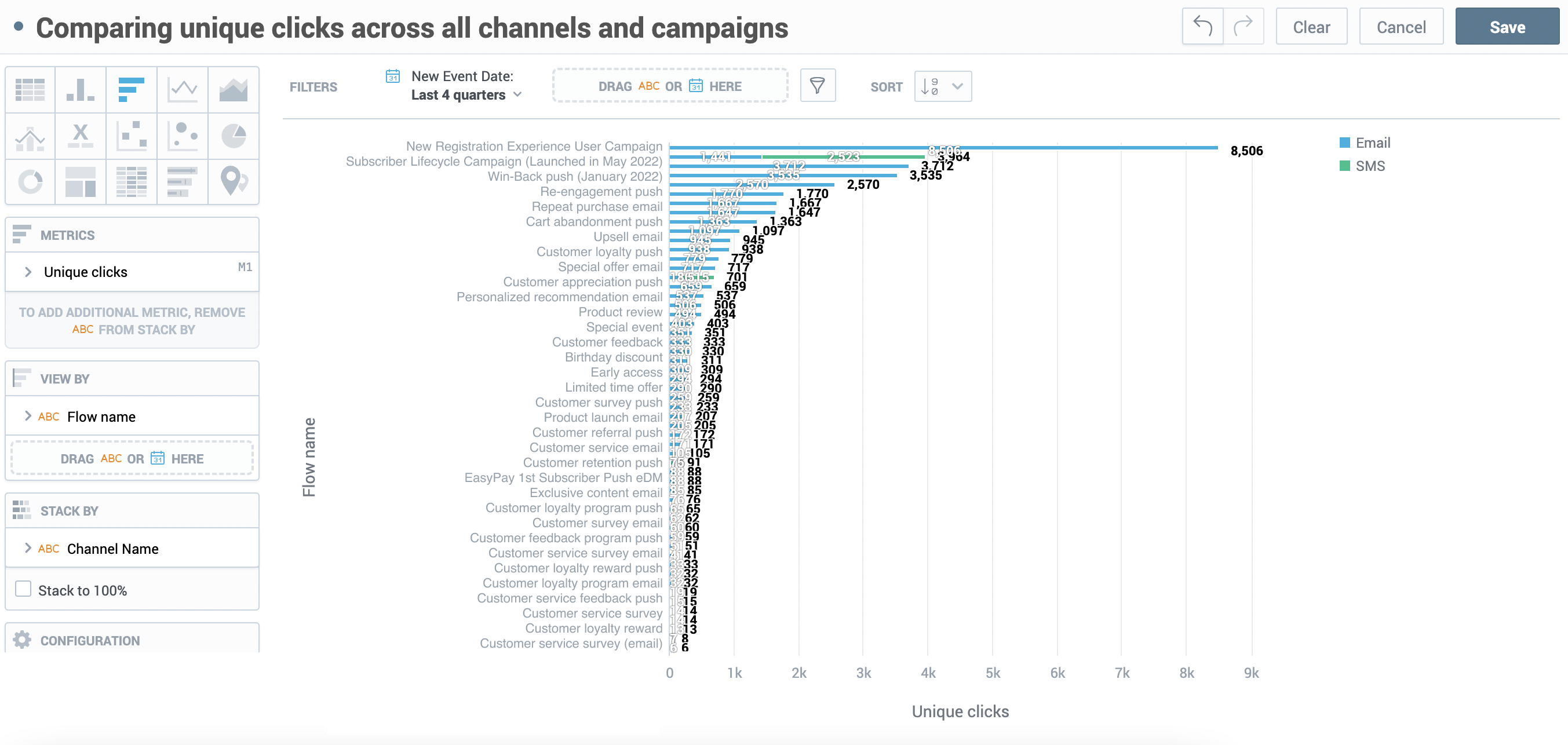This bar chart shows the channel metrics to compare channel performance. For every channel used in your flows see the total number of sent, delivered, opened, and clicked messages.