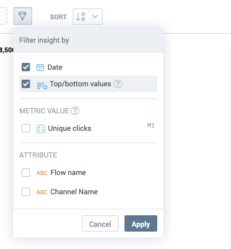After you add an insight to your dashboard, you can further configure it by drilling deeper into the insight and creating additional actions that run when you click a value. For example, link specific metrics or widgets with detailed breakdowns or other reports. You can drill into the following: