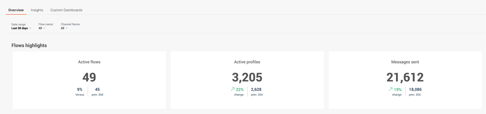 The overview dashboard provides a detailed view of all flow communication performances. It is tailored to glance at the fundamental metrics so you can quickly identify how well it affects your audience engagement.
