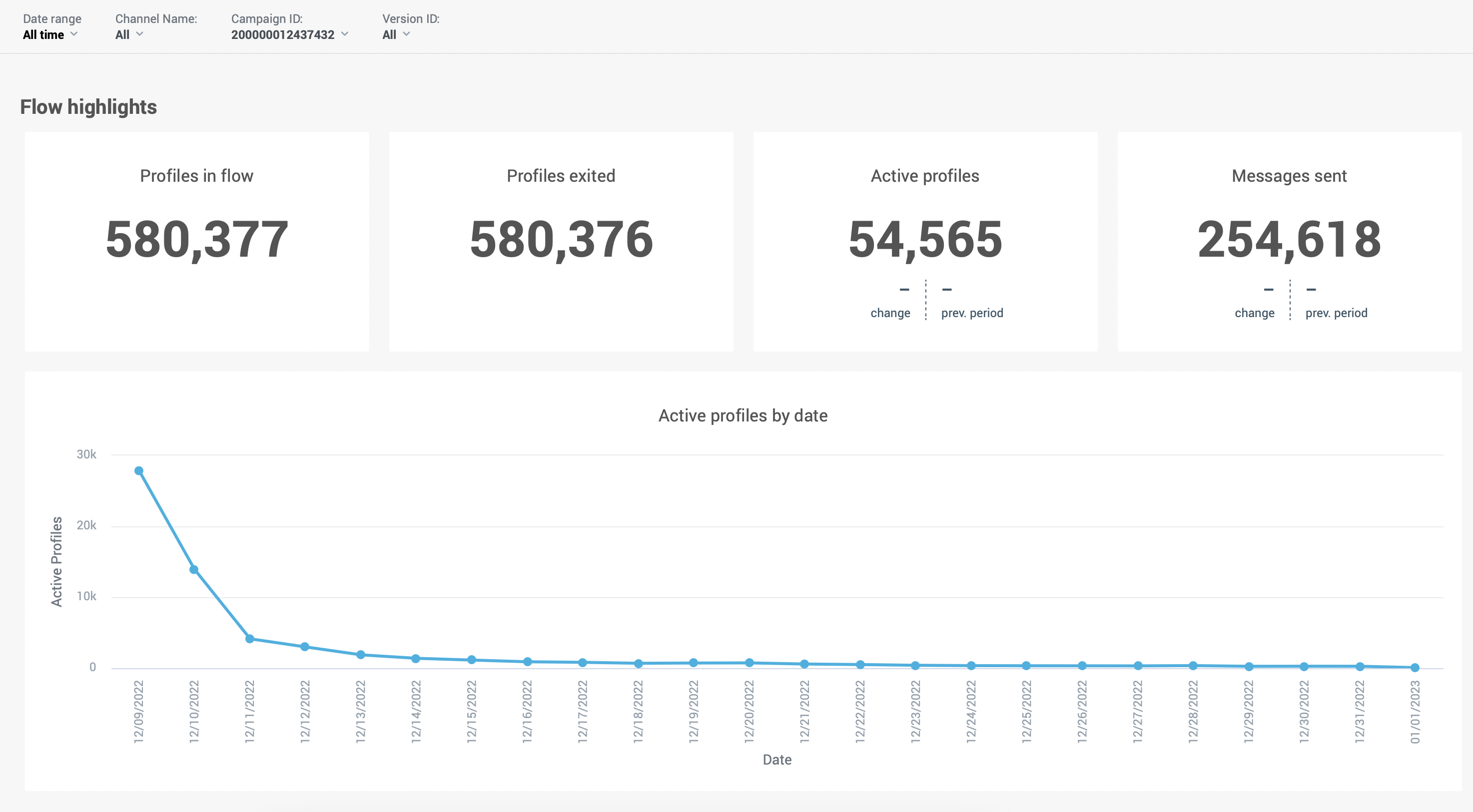 | Profiles in flow | The number of unique users who have entered the flow. This helps you visualize the audience reach of your campaign within a time range. |