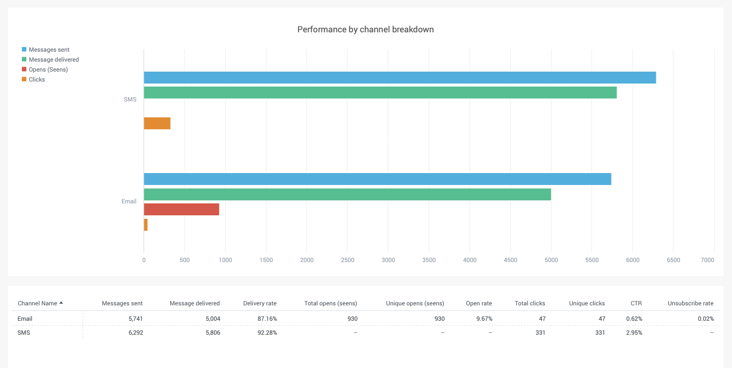 Use this summary to track campaign reach, message delivery rates, opens, clicks, and click through rate (CTR) to name a few.
