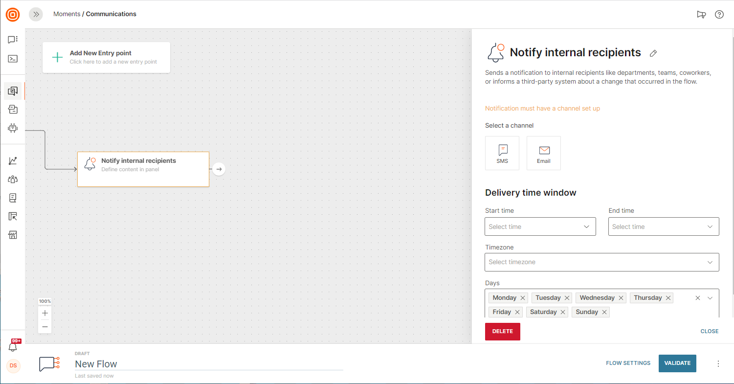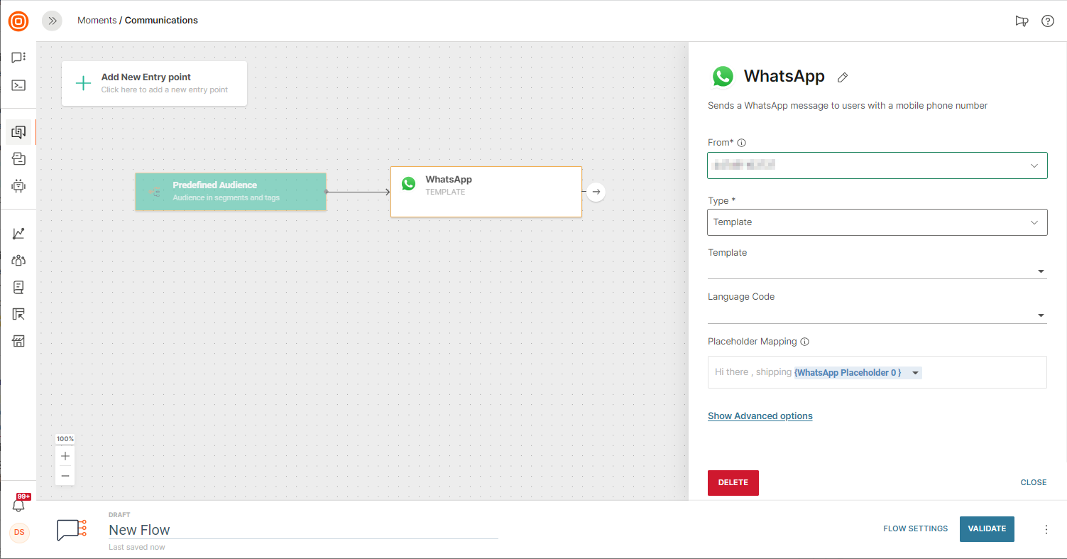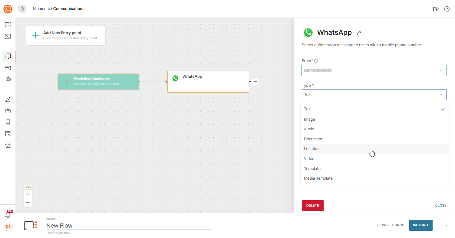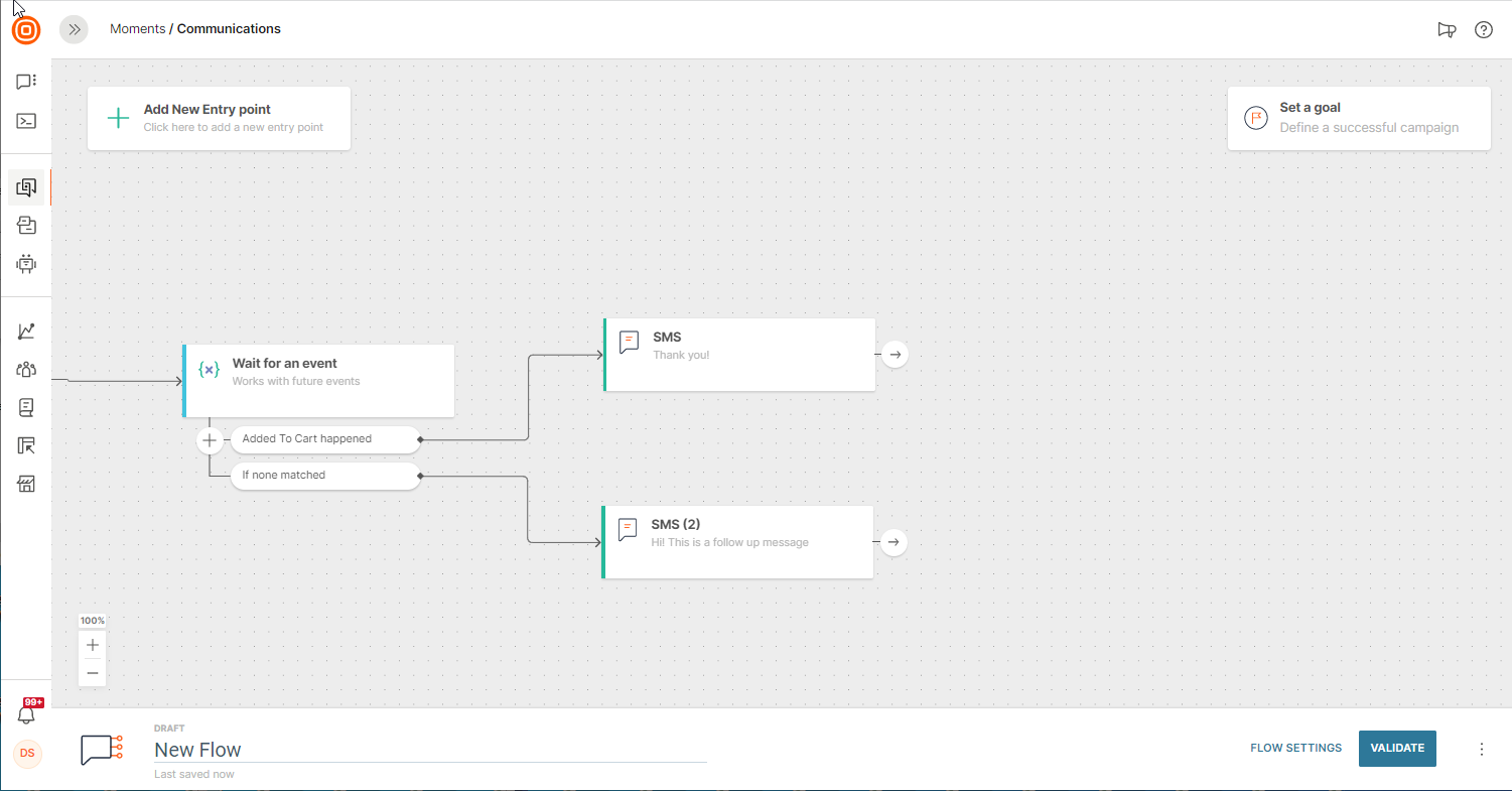 - Channels: The different channels such as SMS, Email, or WhatsApp through which you can engage your audience during a flow journey.