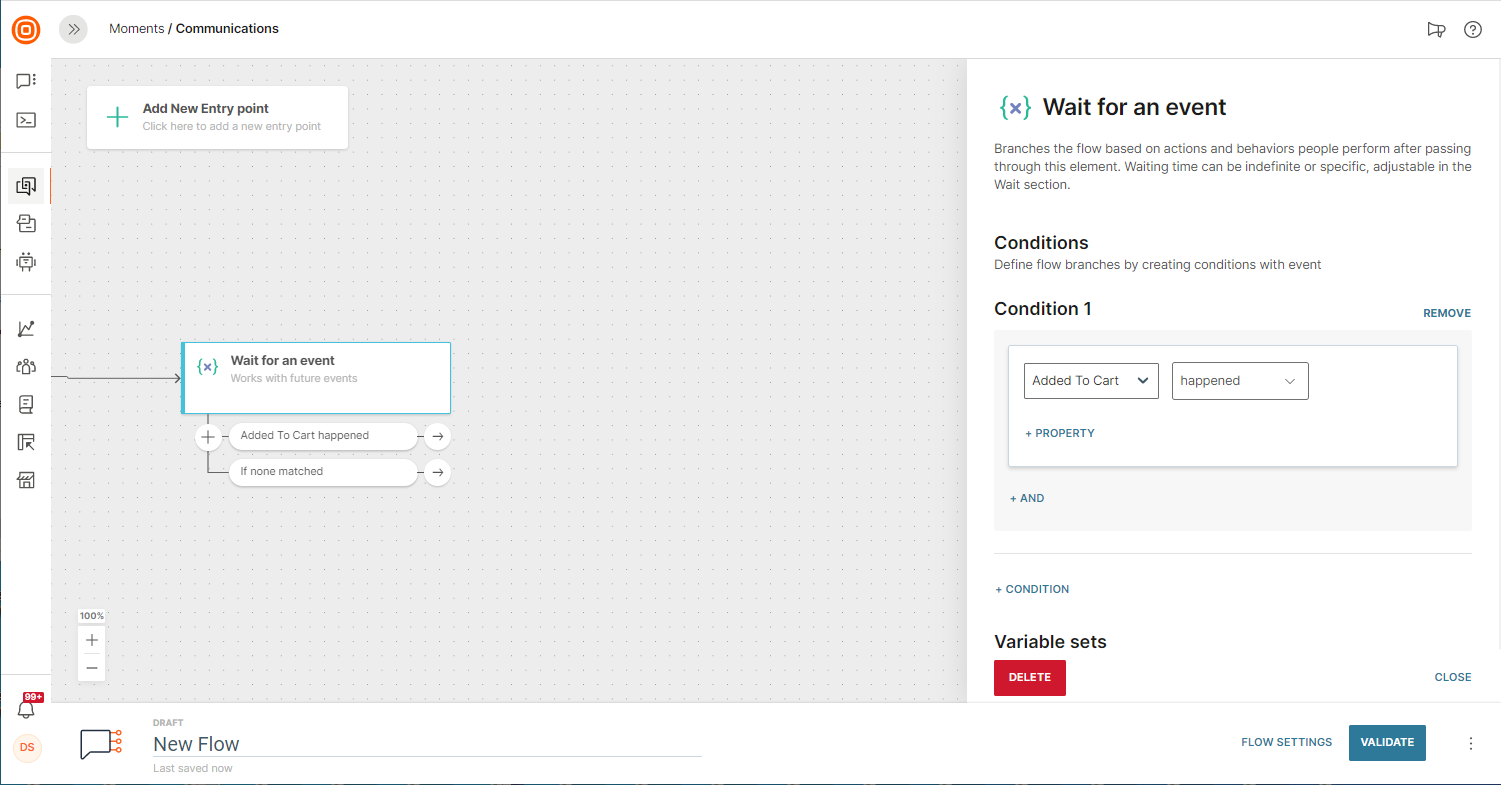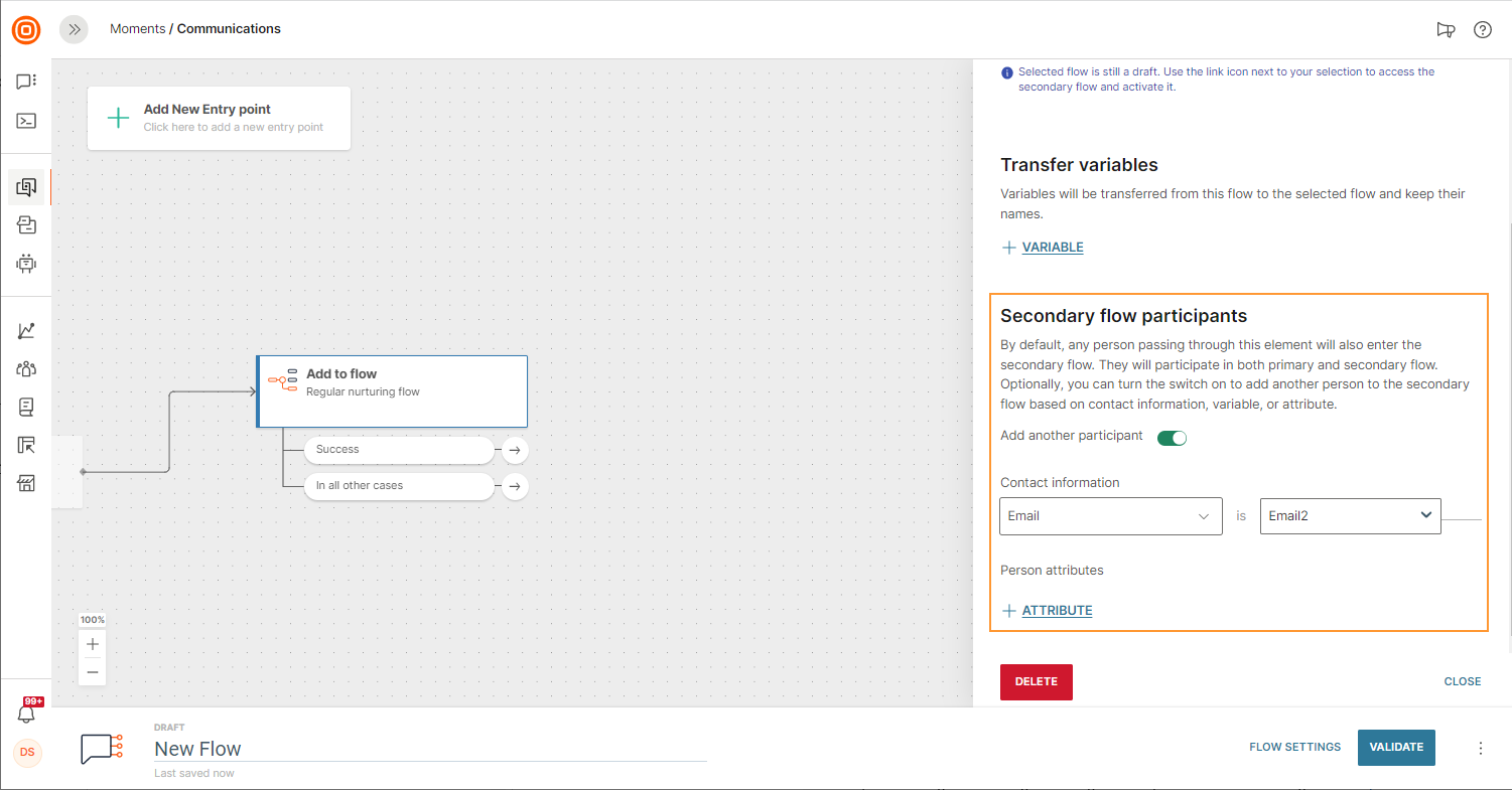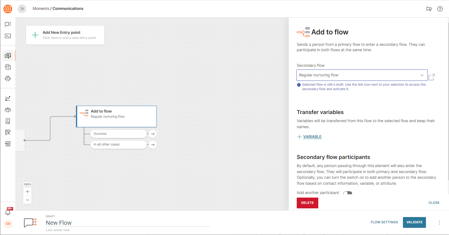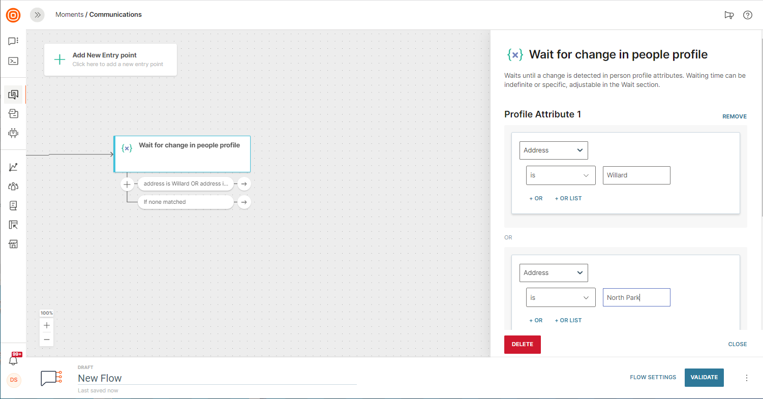 - Entry points and exit: The different ways in which an end user can enter a flow and exit the flow. Example: Trigger the flow and start a personalized journey when there is a change in the person profile.