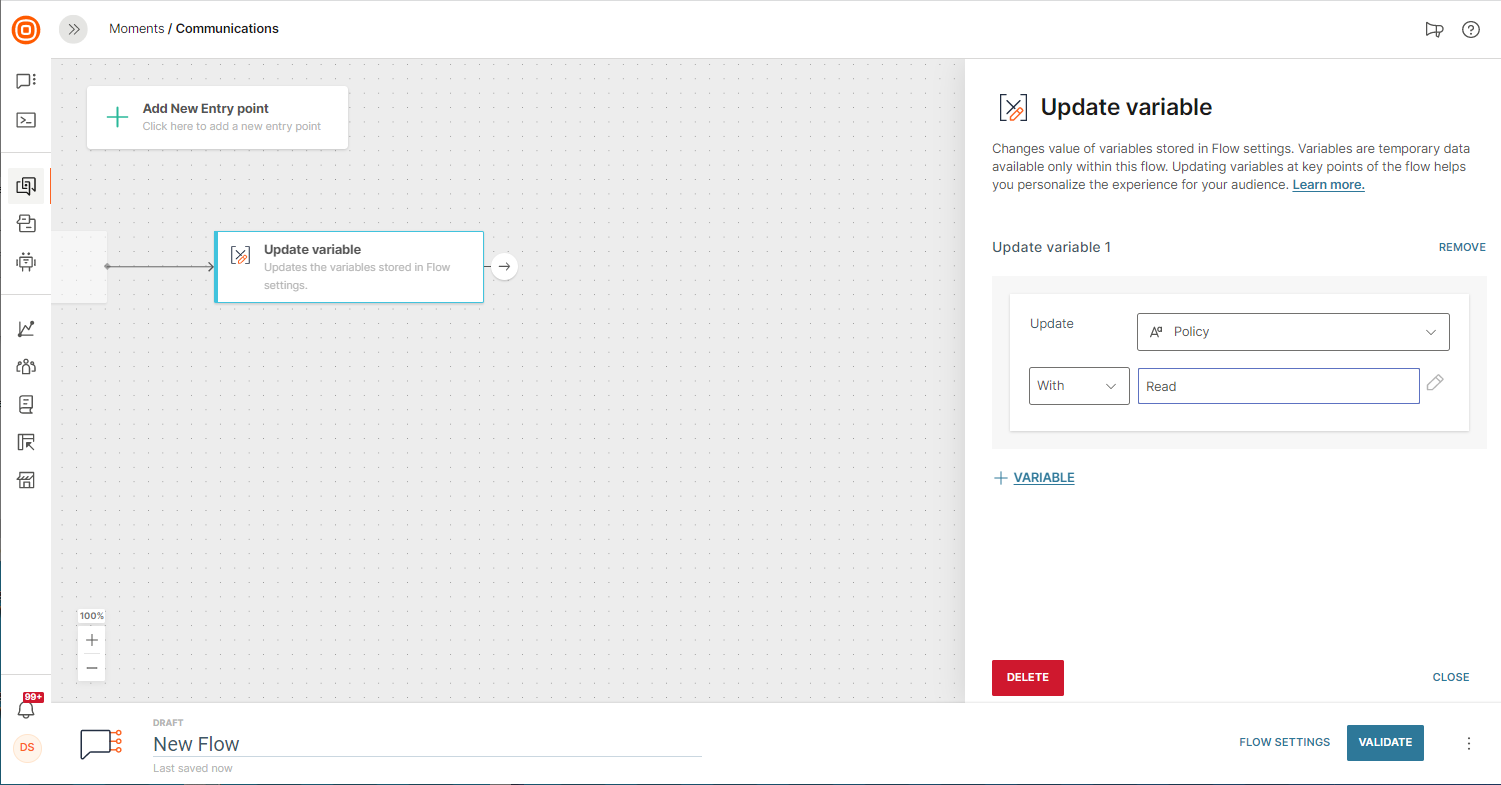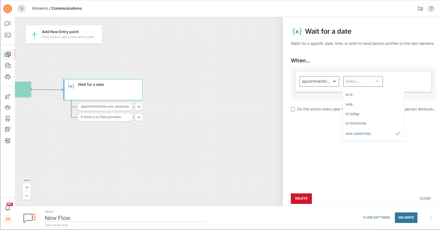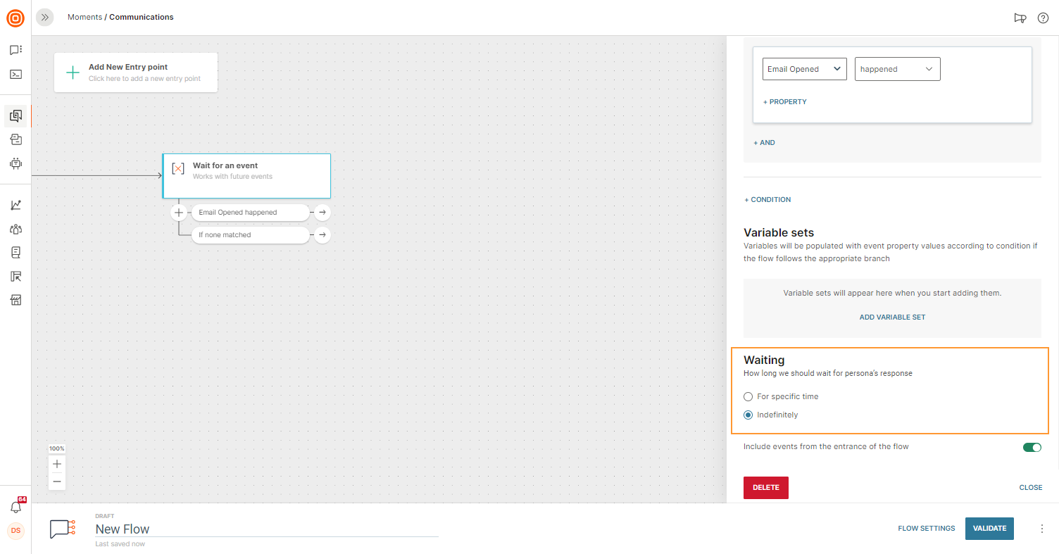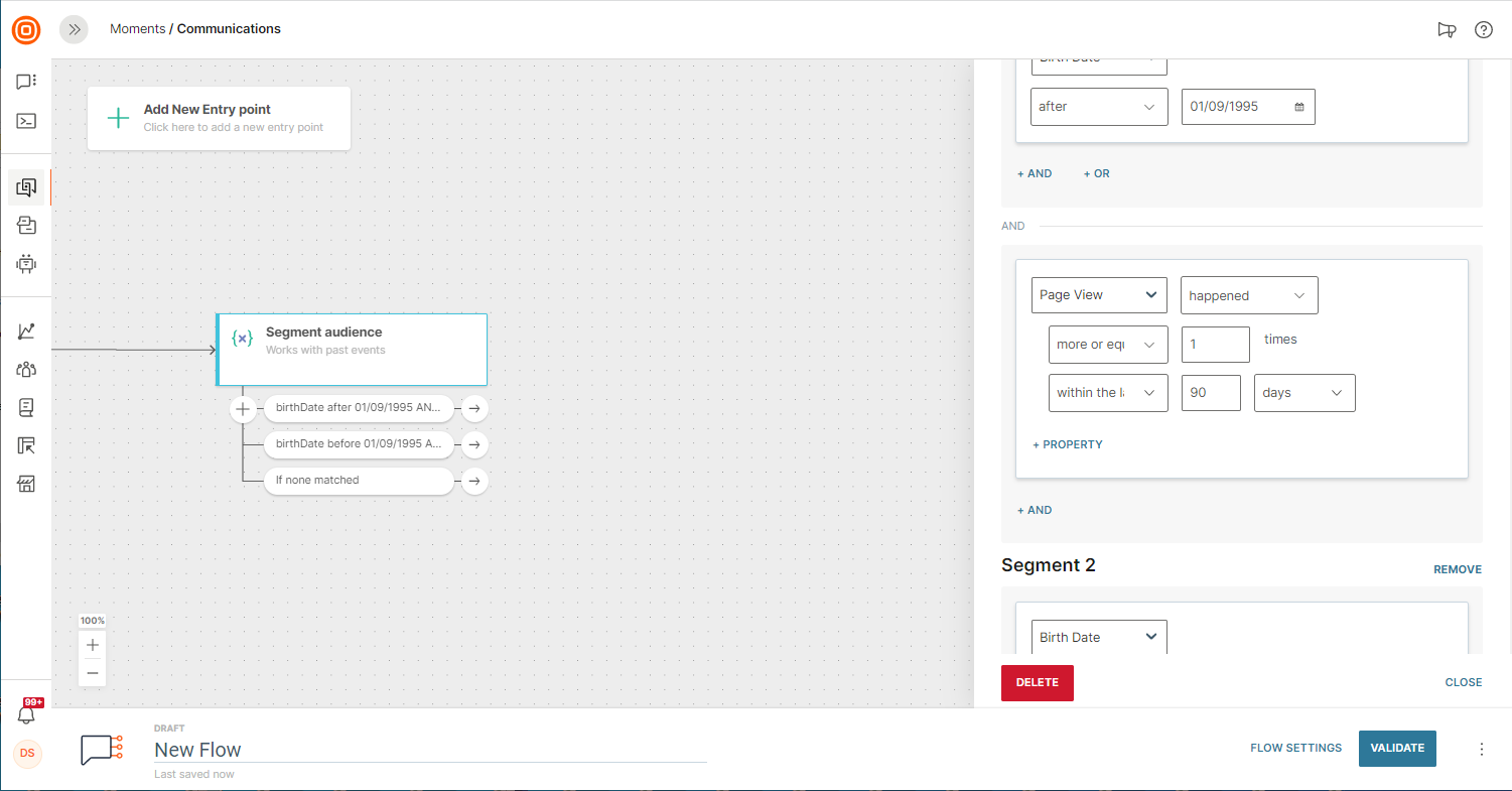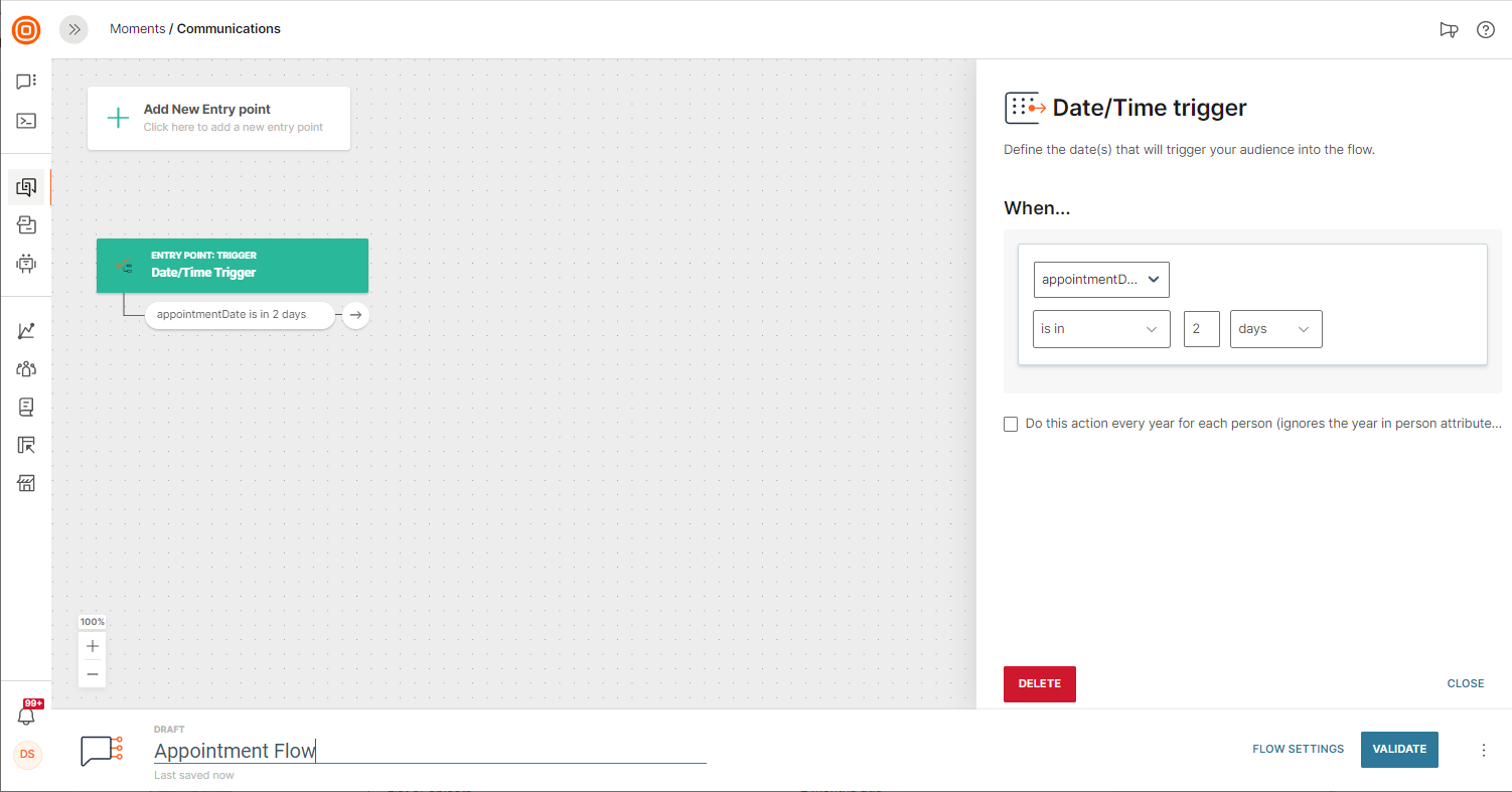 - Entry points and exit: The different ways in which an end user can enter a flow and exit the flow. Example: Trigger the flow and start a personalized journey when there is a change in the person profile.