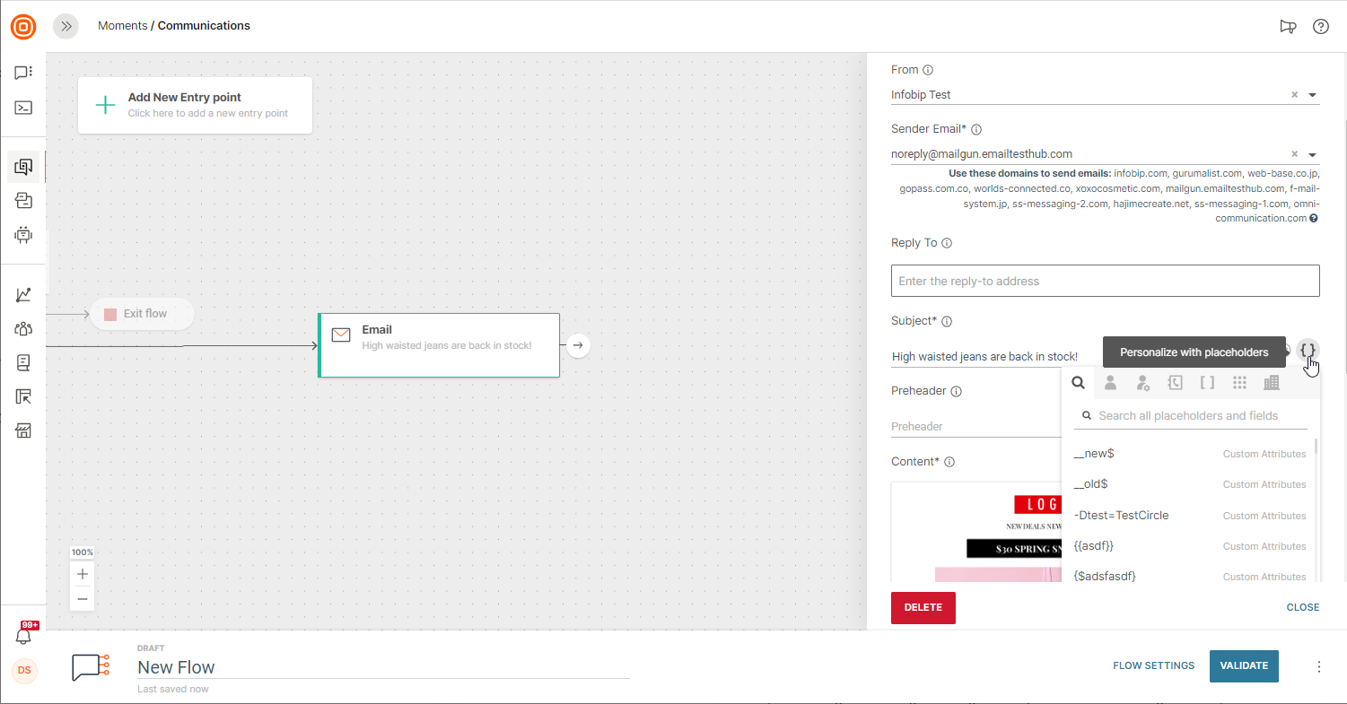 In the flow elements, you can use placeholders in various fields, such as messages and URLs. The fields in which placeholders are available depends on the element. Example: In the Send email message element, you can add placeholders in the Subject field.