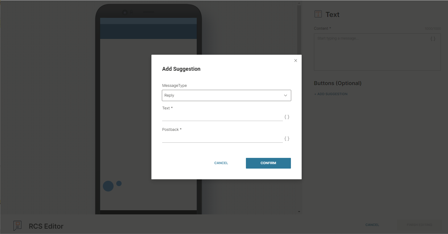 To add a placeholder, select the curly brackets {} icon in the field. Select the relevant placeholder from the list.