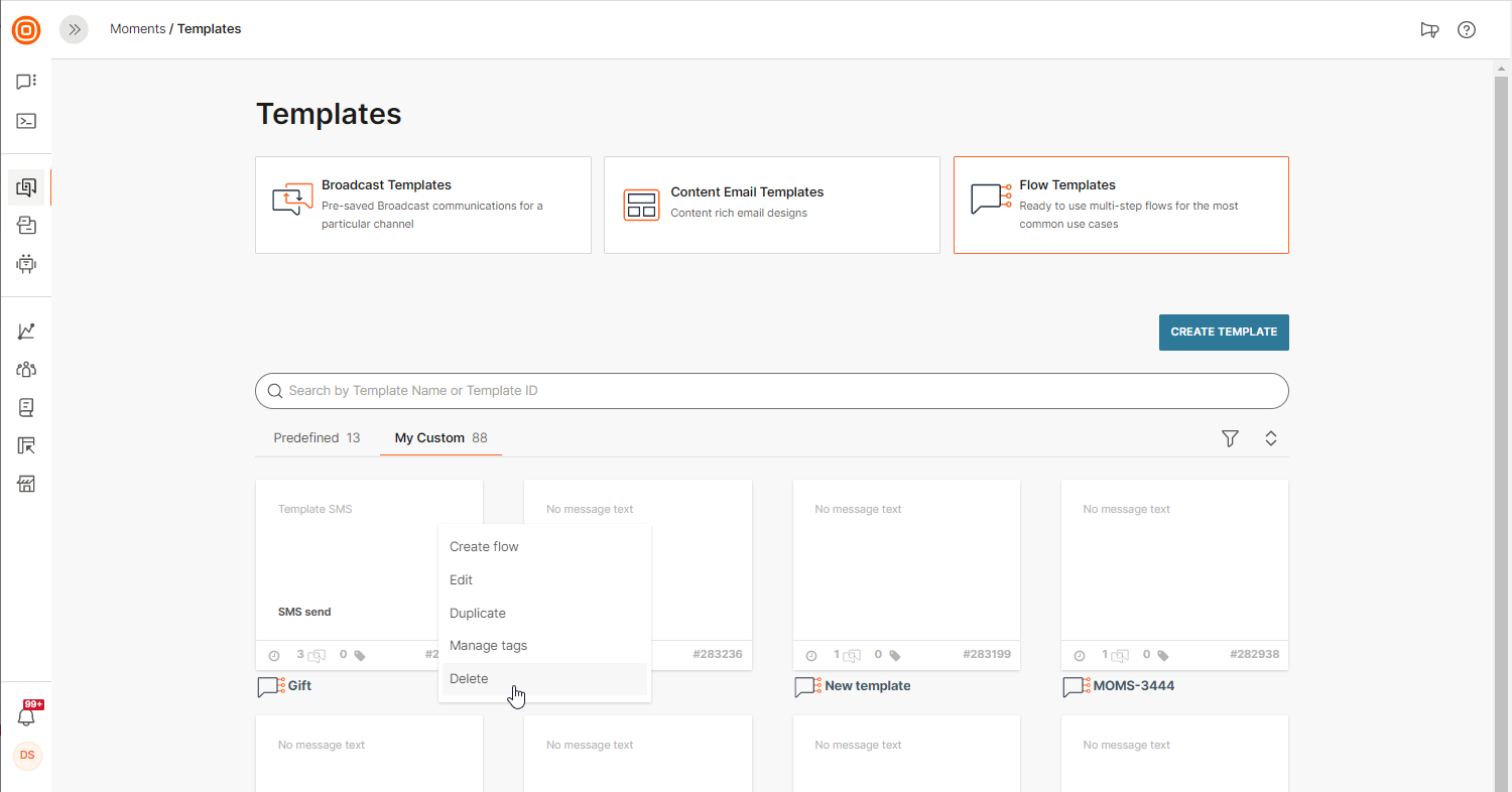To access this page, go to the Infobip web interface (opens in a new tab) > Moments > Templates > Flow templates > My custom tab.