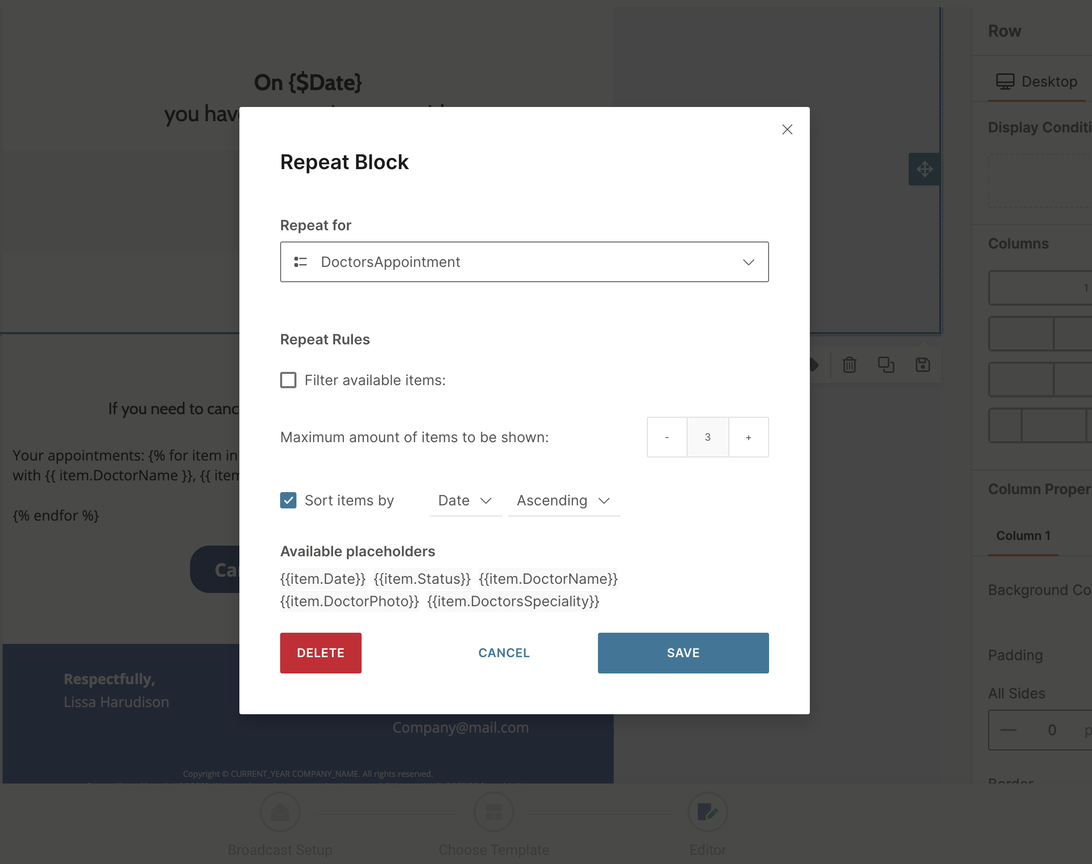 - Select your list attribute in Repeat for. You can choose to additionally filter and sort items to be shown. Use the Maximum amount counter to limit amount of items in your message. You will see all available list properties under the Available placeholders section.