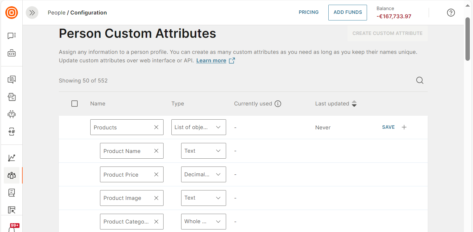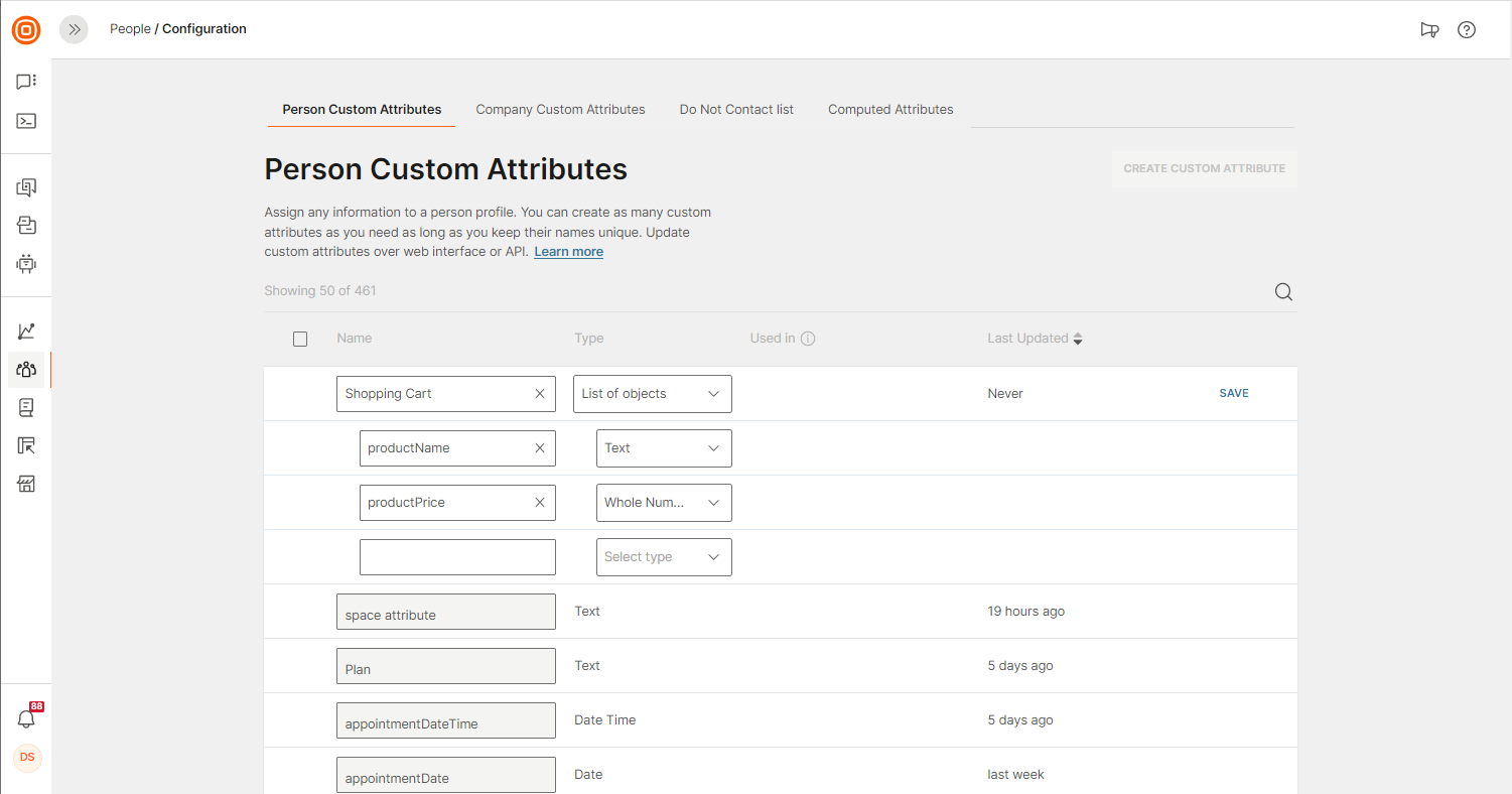 - On the Infobip web interface (opens in a new tab), go to People > Configuration > Person Custom Attributes.