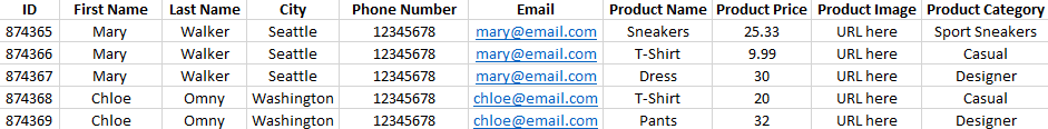 This example is about what the final result will be when you select the first item from the list, including fields describing the item, such as Product Name, Price, and URL.