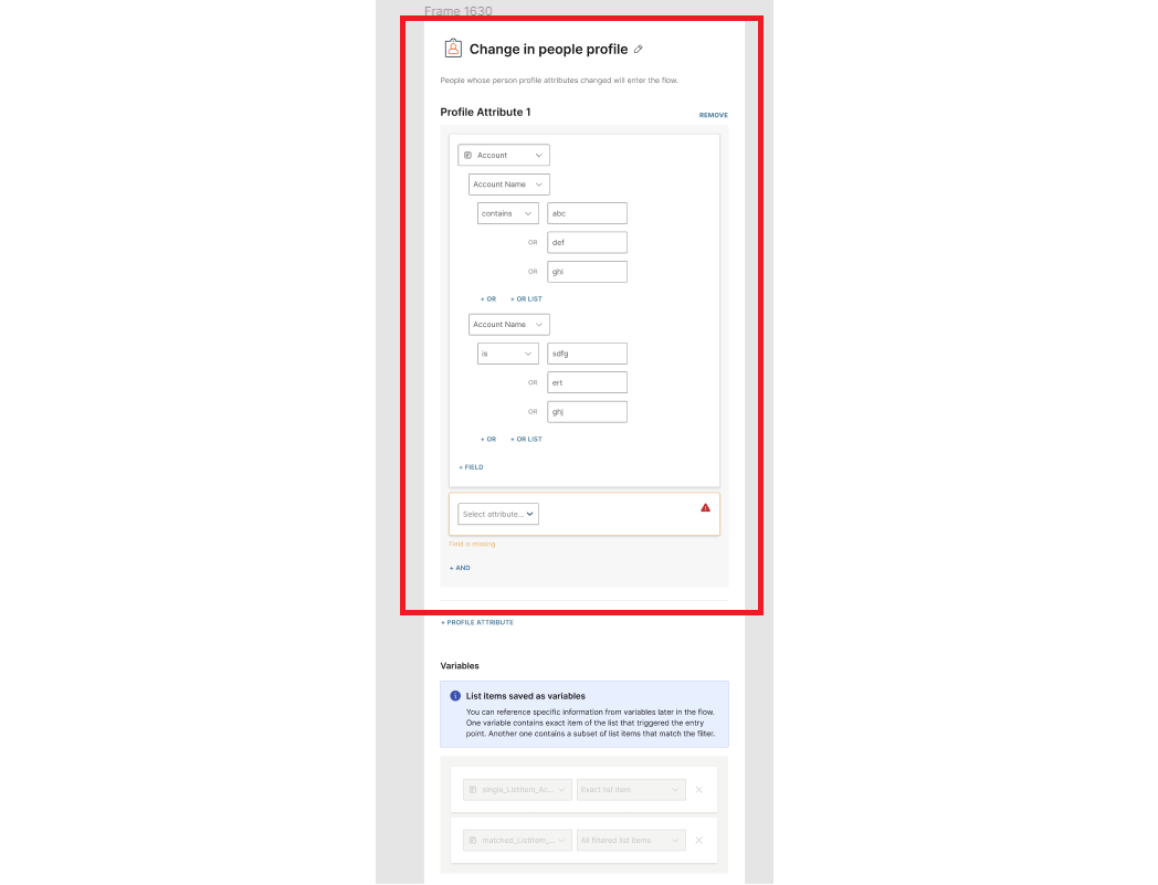 - After you have finished creating the filter for your use case, all list items per persona that match this filter will be collected automatically in a bespoke list variable. This variable will have a unique naming convention: matched_Lisitem_%listName%(the variable contains all items per persona that match this filter), or single_ListItem_%listName% (this variable contains information about the exact list item that triggered the Flow). It is designed to contain information about only 1 item for better personalization and possible segmentation at a later stage. This variable is not editable and cannot be deleted, however, you can change the variable names in Flow settings