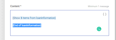 For example, if your customer has more than one loan and you want to notify them of an upcoming payment date for one of the loans, then lists will help you achieve that. This is much more efficient than creating separate custom attributes for each loan or account that your customers may have.