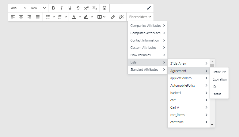 If you want to use list variables in your communication, then select Placeholder > Flow Variables when editing your content and select the list variable you want to include in your communication. The list variables will look like this: