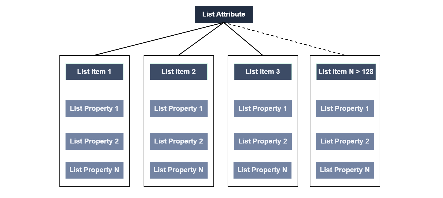 You can add a maximum of 128 properties to a list attribute.