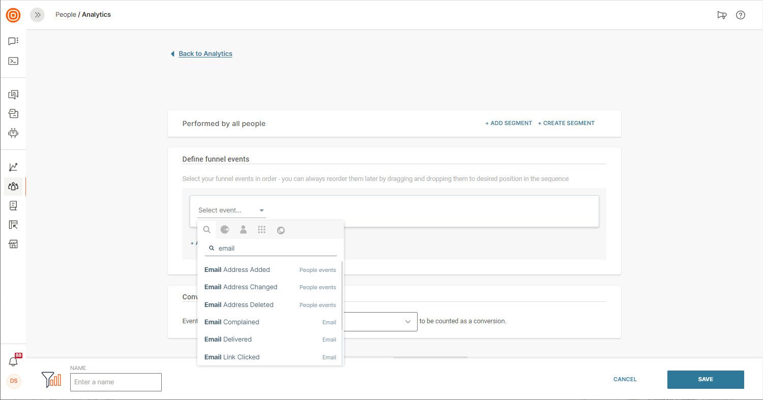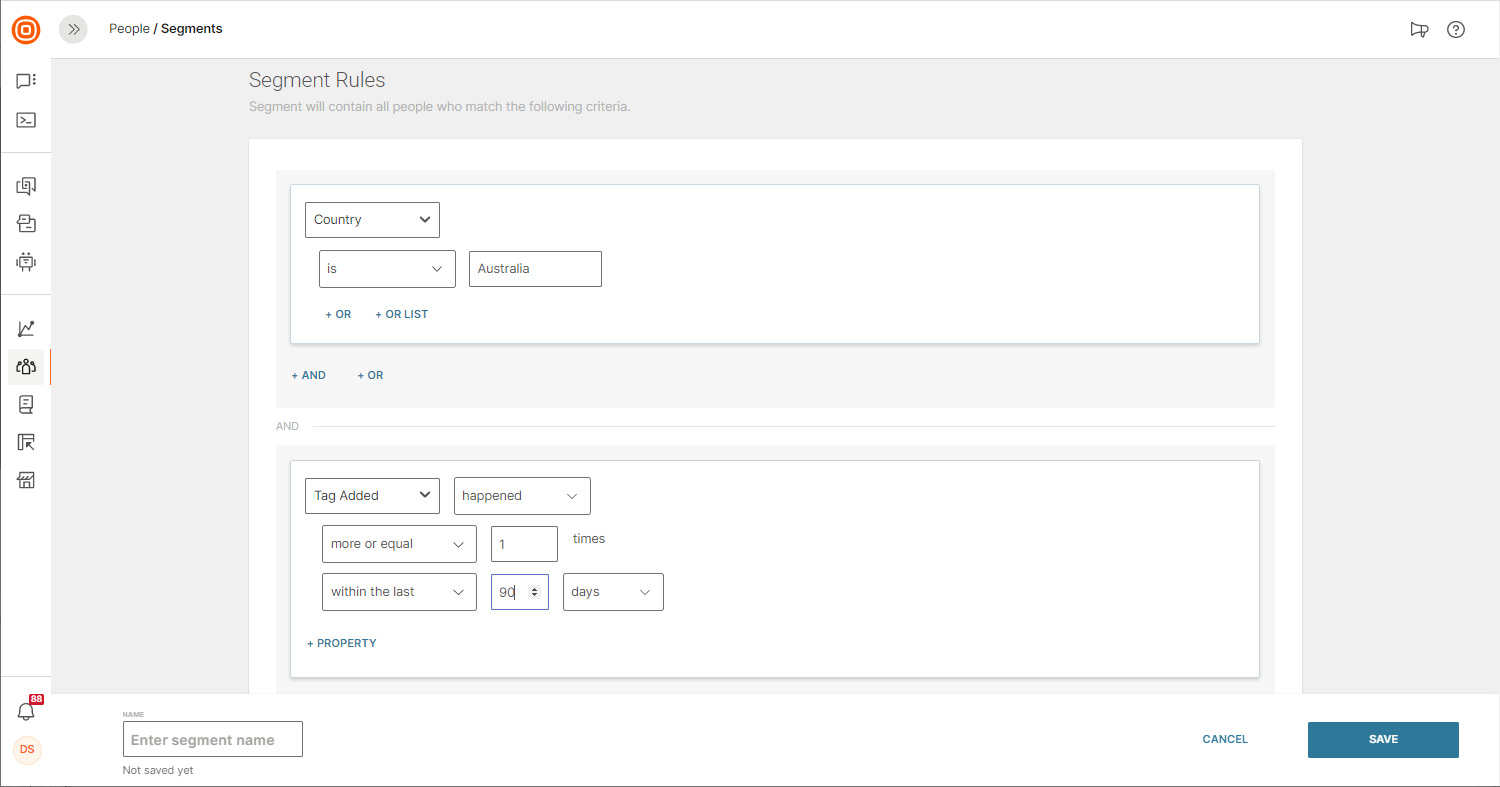 You can create segments on the Segments page in People. When creating segments, combine events and attributes for more relevant segmentation.