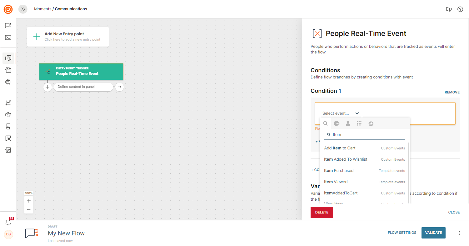 Example: To send a message to all end users who add items to cart, in your communication flow, use the People real-time event trigger with the custom event Item Added to Cart.