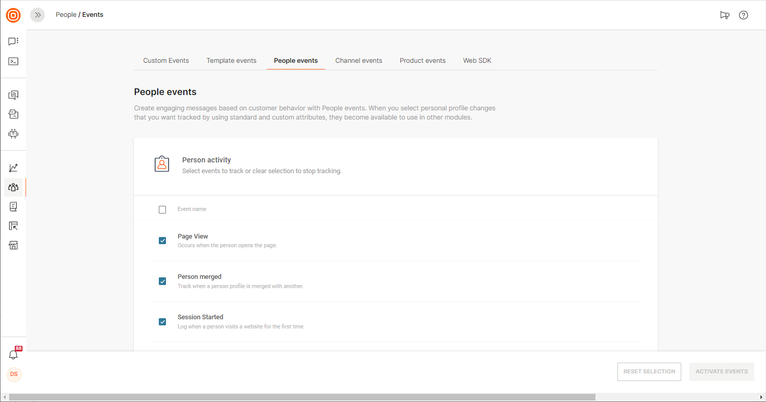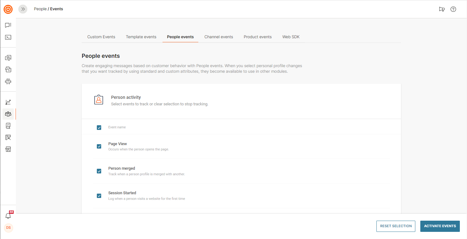 Custom events: These are the events that you create in People to track end user activity on your digital assets such as your websites, mobile apps, and other platforms and applications. Custom events are specific to your business.