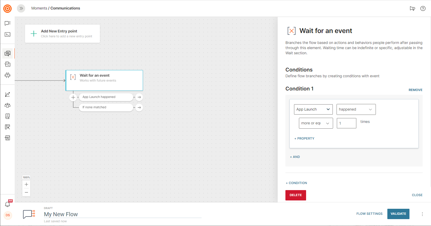 Example: In the Wait for event element, select Checkout Finished as the event to wait for. Enter the amount of time for which the element needs to wait for this event to occur.